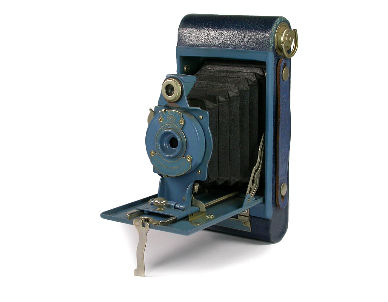 Klapp-/Laufbodenkamera von Kodak aus der Verkaufslinie Hawk-Eye (später Hawkeye), 1931-1932, USA, für den Rollfilm 120. Verschluss: Kodex No. 0 (T, B, 1/25-1/50 Sekunde).
