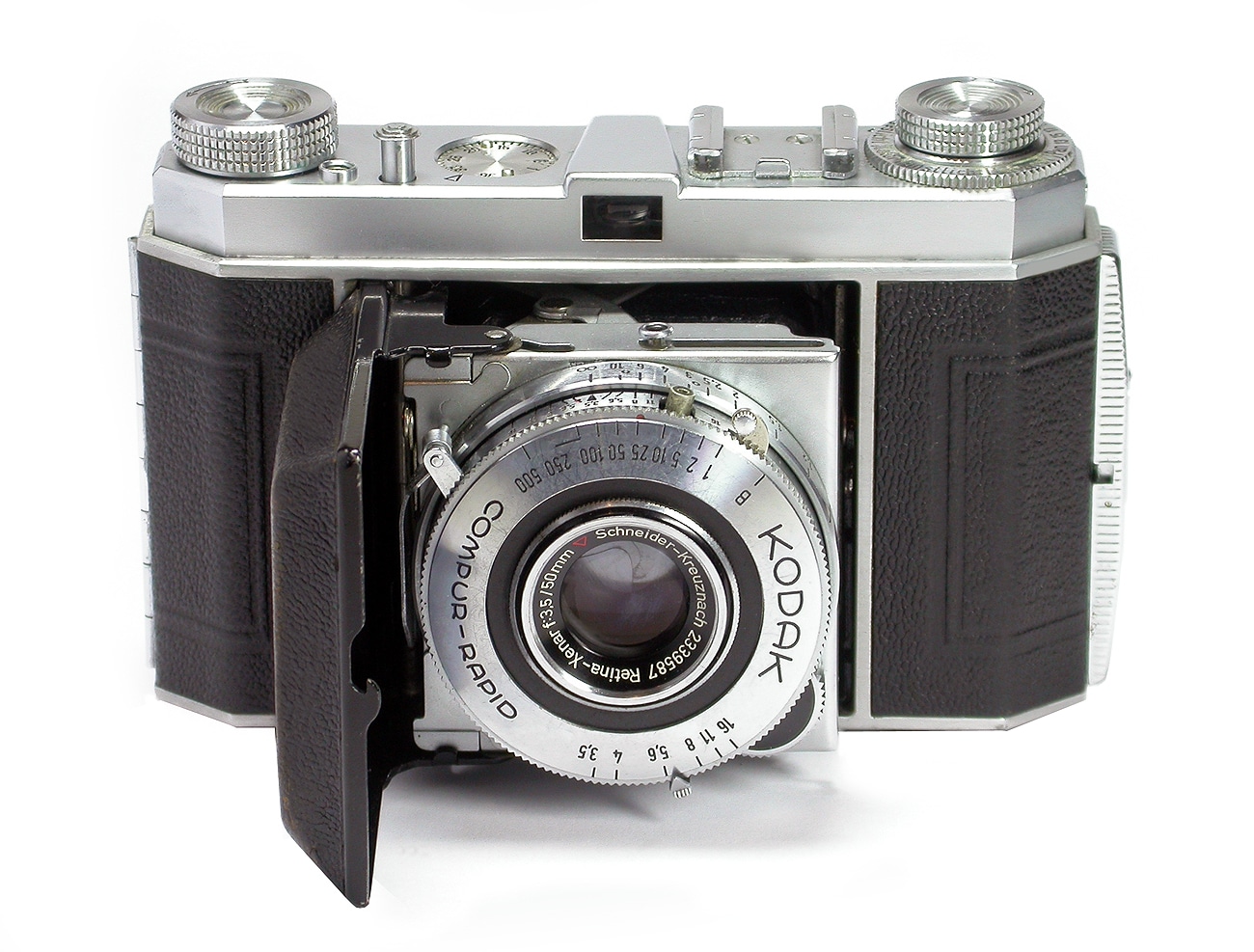 Bekannte deutsche Sucherkamera für den Kleinbildfilm 135 (Negativformat 24 x 36 mm), hergestellt in vielen verschiedenen Variationen: stets sehr kompakt und stabil, durch die Spreizenkonstruktion zusammengeklappt fast eine Westentaschenkamera. Dieses Exemplar wurde 1949/1950 in 130.000 Stück gebaut. Hier mit Objektiv Schneider-Kreuznach Retina-Xenar 1:3,5/50 mm, Nr. 2339587, im Verschluss Compur-Rapid (B, 1 bis 1/500 Sekunde, mit Blitzsynchronisation). Weitere Ausstattung: Newton-/Fernrohrsucher, Zählwerk, Stativgewinde, Zubehörschuh, Filmmerkscheibe.
