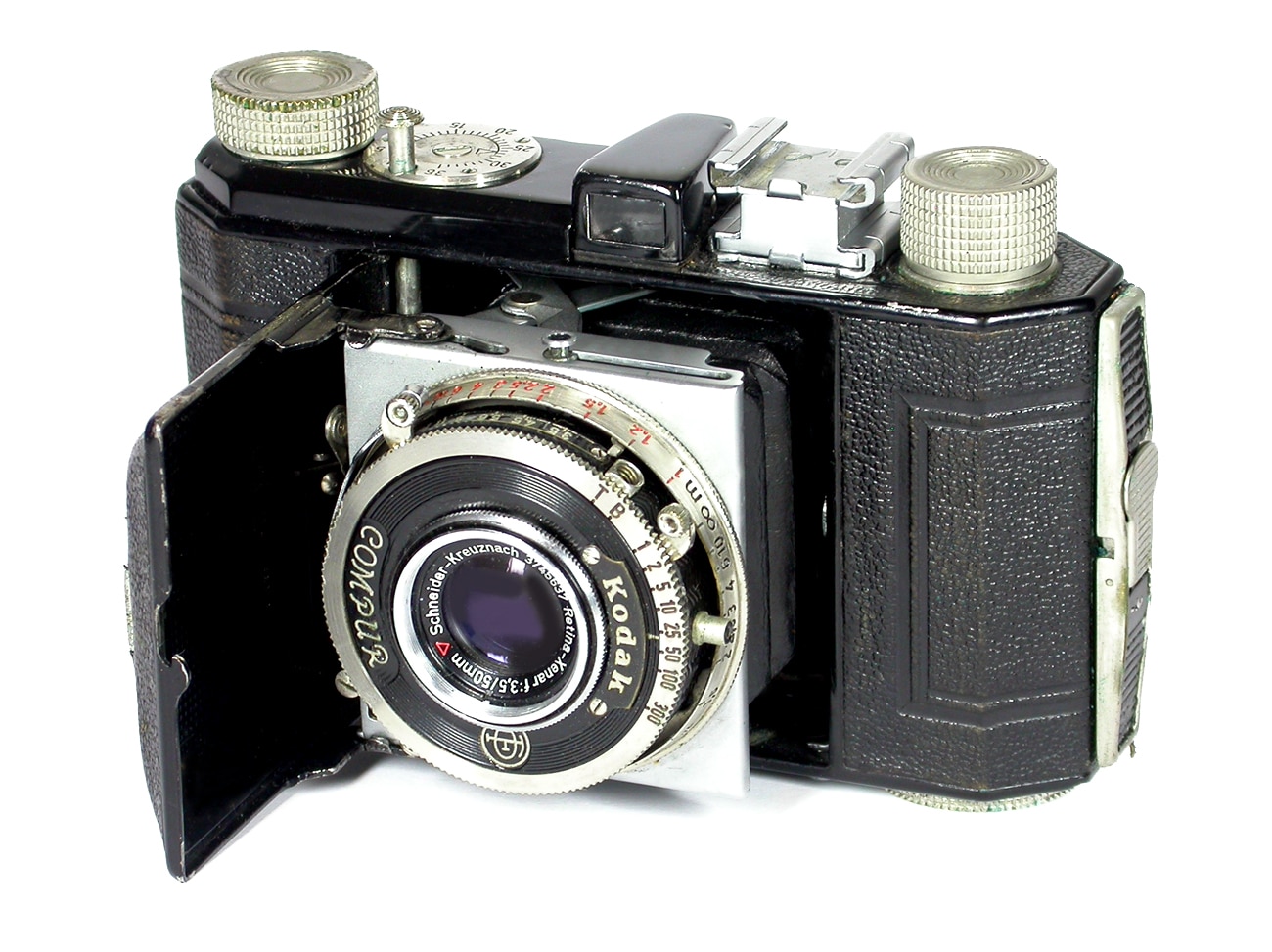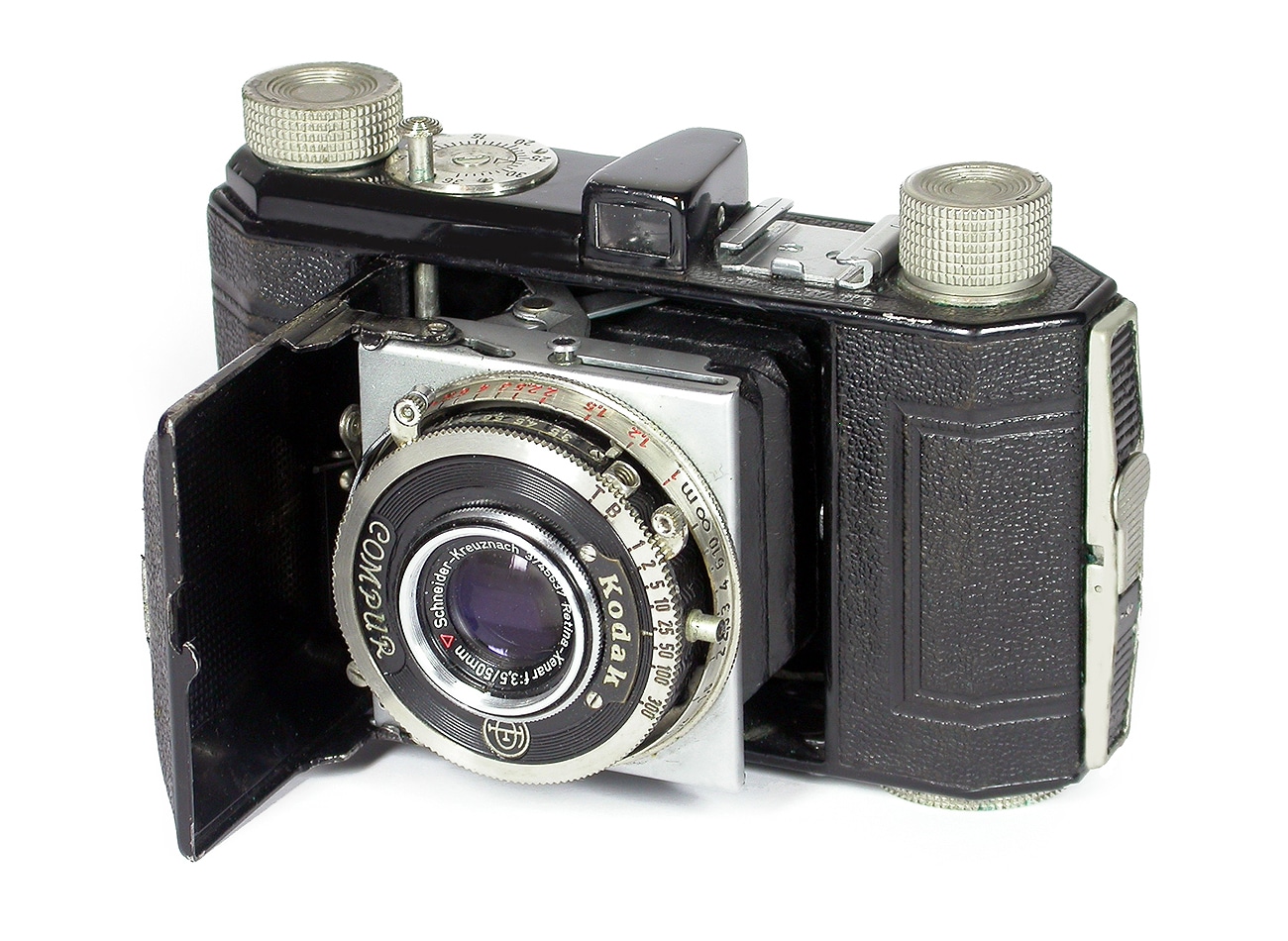 Normalausstattung Ektar in Compur- oder Compur-Rapid-Verschluss, seltenere Varianten haben Tessar, Xenar oder Kodak-Anastigmat. Das Museums-Exemplar hat einen Compur-Verschluss (T, B und 1 bis 1/300 Sekunde) sowie ein Schneider-Kreuznach Xenar 1:3,5/50 mm. Dazu gab es eine aufsteckbare Erhöhung des Zubehörschuhs, denn zwischen Rückspulknopf und Sucher passte kein Gerät so wirklich hinein. Das Museums-Exemplar wurde in den 1950er-Jahren offenbar „modernisiert“: Das Objektiv (vergütete Frontlinse, Angabe der Brennweite in mm) sowie der Blitzkontakt weichen vom Originalzustand ab.