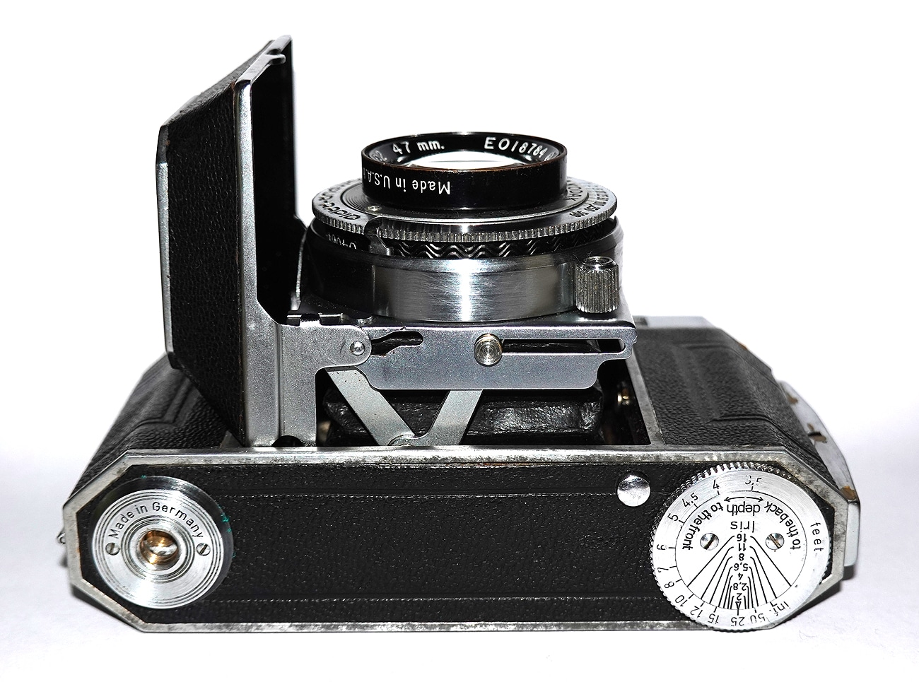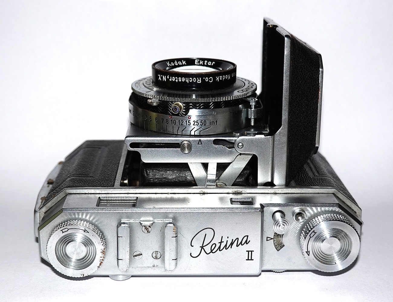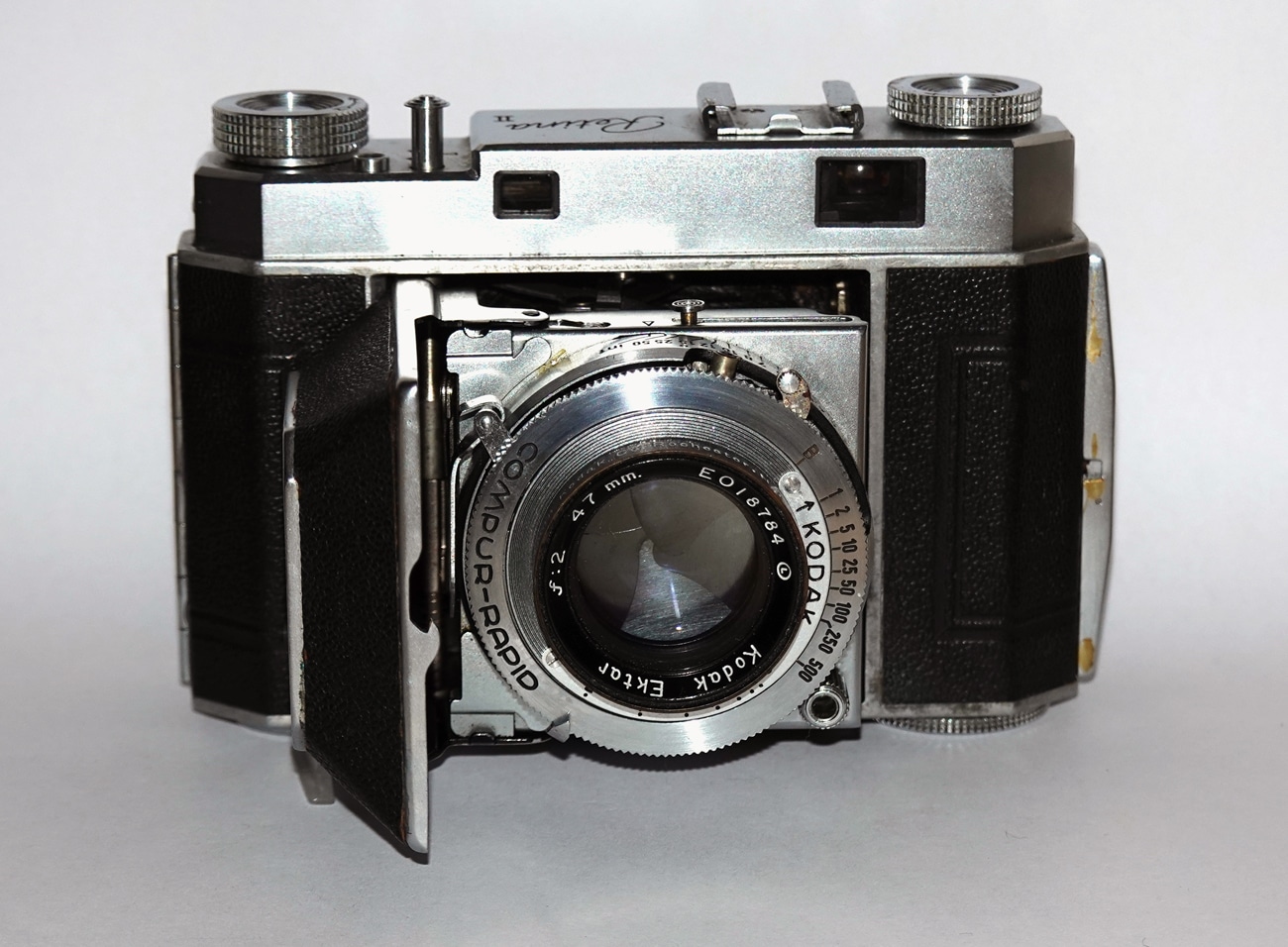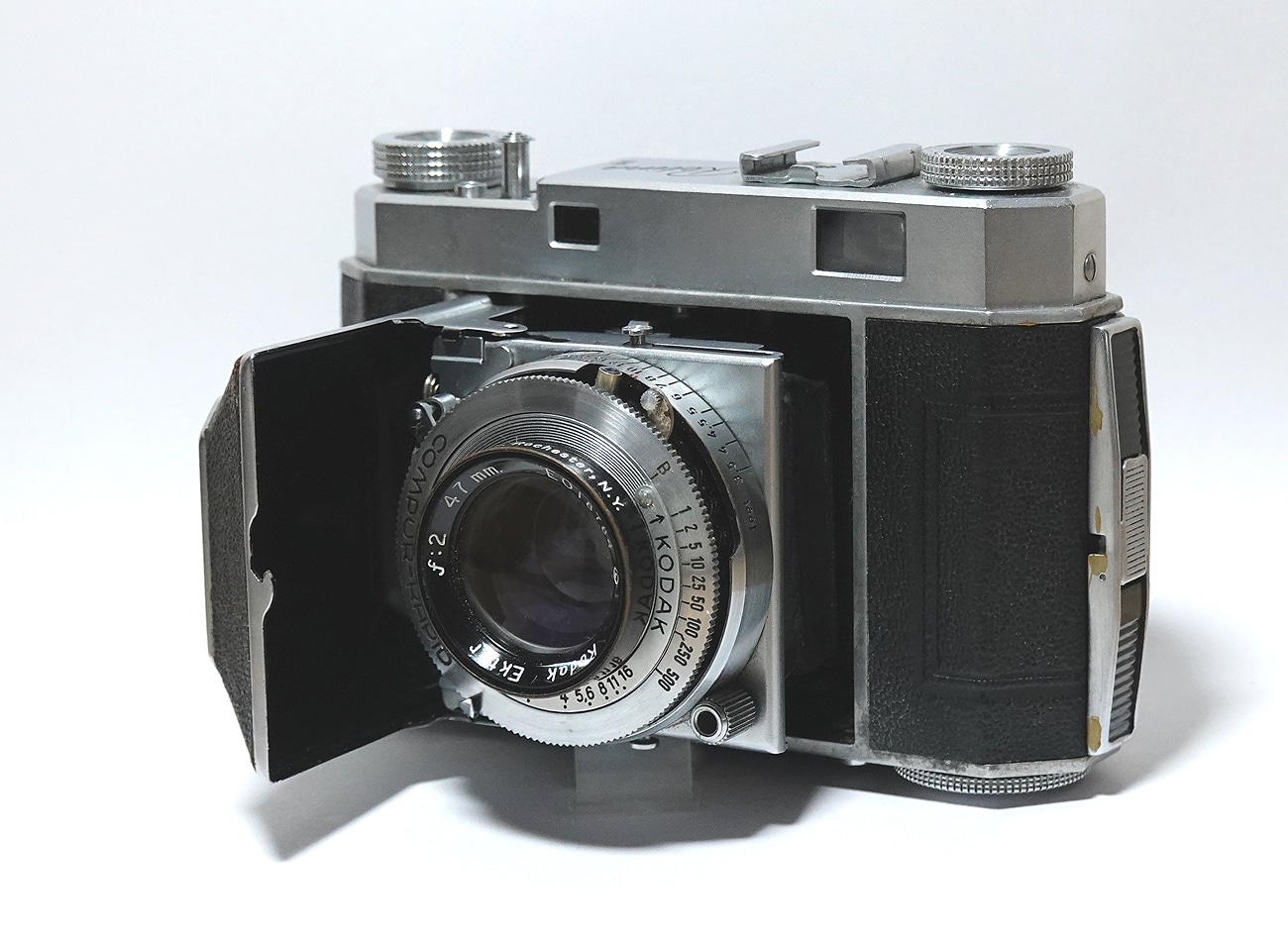 Messsucherkamera für den Kleinbildfilm 135 (Aufnahmeformat 24 x 36 mm), hergestellt von 1946 bis 1949. Objektiv: Kodak Ektar 1:2,0/47 mm (Nr.) EO18784 L (eingekreist), Made in U.S.A. by Eastman Kodak Co. Rochester, N. Y. Das Ektar ist in diesem Fall eine sechslinsige Konstruktion. Entfernungsskala in Feet. Fernrohr-/Newtonsucher mit gekuppeltem Entfernungsmesser. Verschluss: Compur-Rapid (B, 1 bis 1/500 Sekunde). Zubehörschuh, Blitzsynchronkontakt (nachgerüstet). Tiefenschärfenrechner auf der Unterseite.