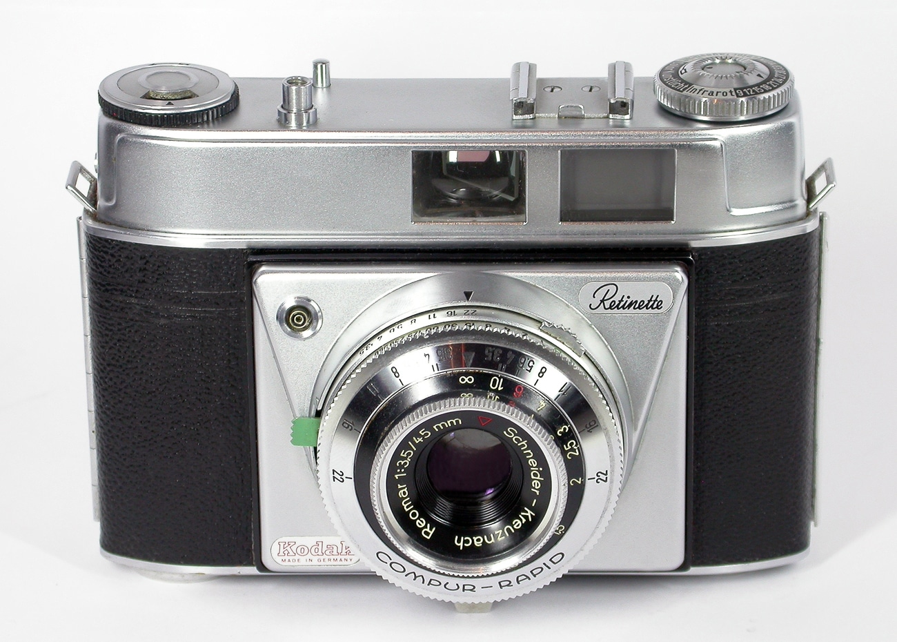 Eine der vielen bekannten Kodak-Kameras aus Deutschland (1958 bis 1960 gebaut in rund 118.000 Exemplaren) für den Kleinbildfilm 135 (Negativformat 24 x 36 mm). Dieses Exemplar ist (an der Nummer erkennbar) eine frühe Retinette (noch ohne Namen neben dem Sucher). Objektiv: Schneider-Kreuznach Reomar 1:3,5/45 mm. Sucher mit eingespiegeltem Leuchtrahmen. Zentralverschluss Compur-Rapid mit B, 1 bis 1/500 Sekunde. Selbstauslöser und Blitz-Synchronisation. Schnellschalthebel im Boden.