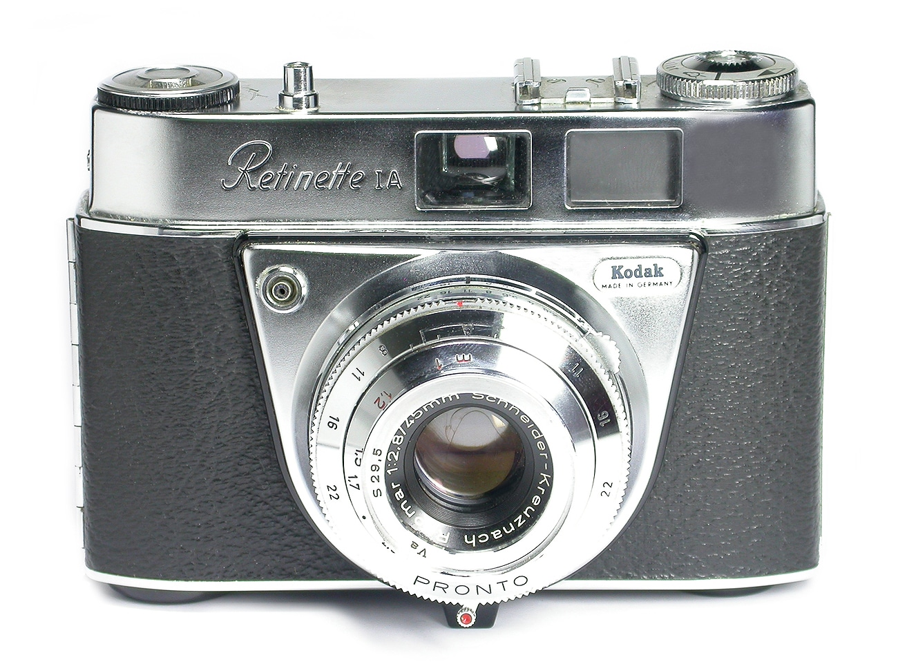 Eine Sucherkamera von Kodak in Deutschland für den Kleinbildfilm 135 (Negativformat 24 x 36 mm), gebaut von 1960 bis 1963 in 217.000 Exemplaren. Hier mit Objektiv Schneider-Kreuznach Reomar 1:2,8/45 mm und Verschluss Pronto bis 1/250 Sekunde, mit Vorlaufwerk. Sucher mit eingespiegeltem Leuchtrahmen.