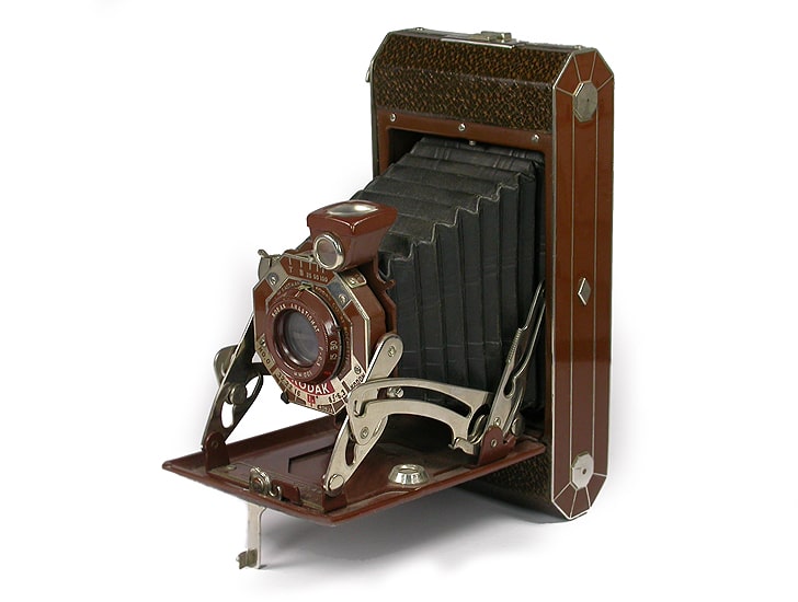 Balgenkamera Six-20 Kodak, made in USA, Mitte der Dreißiger-Jahre bis Anfang Vierziger-Jahre. Diese Kamera im Art-Deco-Stil wurde in Amerika und in England in unterschiedlichen Ausführungen, mit verschiedenen Farben und Objektiv-/Optikkombinationen produziert. Dieses US-Modell besitzt eine Spreizenkonstruktion, die beim Aufklappen der Kamera die Optik selbsttätig in die richtige Position bringt. Objektiv: Kodak Anastigmat 1:6,3/100 mm; Kodon-Verschluss No. 0 mit T, B, 1/25 bis 1/100 Sekunde. Stativanschluss. Das war eine der ersten Kameras für den Rollfilm 620, technisch sonst wie Six-16. Hier diese Kamera in Schwarz.