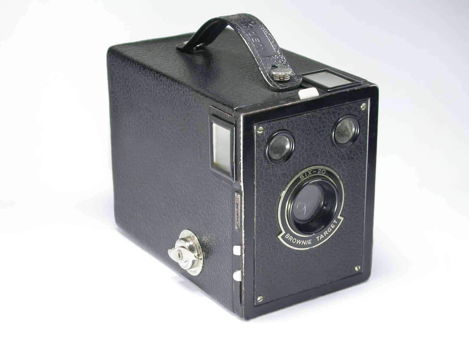 Einfache Boxkamera aus Karton für den Rollfilm 620, vermutlich Dreißiger-Jahre/USA. Diese Version ist weder im Kadlubek, noch bei Steimer noch im Kodak-Buch von Brian Coe zu finden. Innenkonstruktion aus Blech, Holz und Karton. Moment- und Zeitverschluss, zwei Blenden. Dazu sehr gut erhaltene dunkelgrüne Tragetasche.