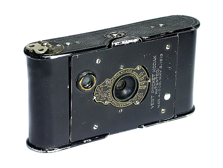 Diese Kodak Vest Pocket – ohne Autographic-Einrichtung – hat eine interessante Geschichte. Die Kamera selbst wurde von 1912 bis 1914 gebaut. Sie hat ein Aufnahmeformat von 4 x 6,5 cm (Rollfilm 127). Spreizenkonstruktion mit Brillantsucher; Zentralverschluss. Soweit eine hübsche Kamera, die in jede ernsthafte Sammlung passt. Diese Kamera hat noch eine interessante Geschichte, die hier erzählt werden soll.