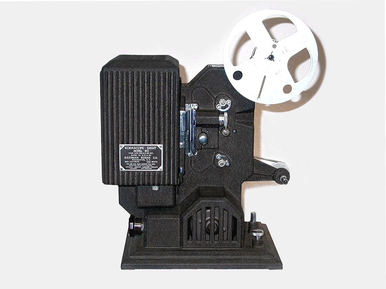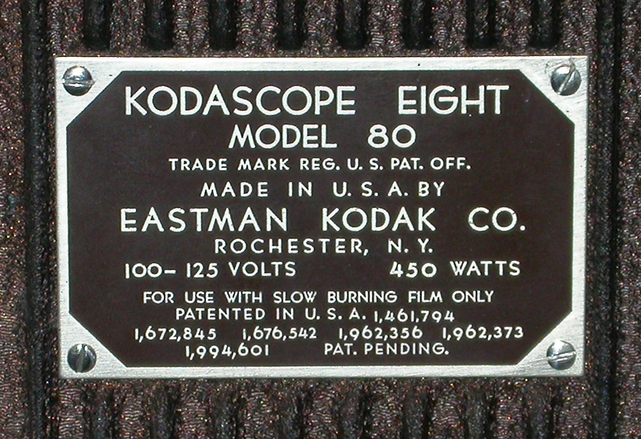 Stummfilmprojektor von Kodak für Normal-8-Filme, Baujahr 1938. Der Filmtransport erfolgt über zwei getrennte einreihige Zahntrommeln sowie einen Einzackengreifer bei einer Bildfrequenz von 16 Bildern/Sekunde. Auch Stillstandprojektion ist möglich, wobei das gewünschte Bild manuell eingestellt werden kann. Eine Dreifach-Umlaufblende sorgt für ein flimmerarmes Bild. Das Objektiv 1:1,6 hat eine Brennweite von 1 Inch (25 mm). Filmprojektion und Rückspulung sind elektrisch angetrieben bei einer Betriebsspannung von 110 bis 125 Volt Wechselspannung oder Gleichspannung. Für den Betrieb mit 220 Volt Wechselspannung ist ein separater Transformator vorzuschalten, die Projektionslampe hat eine Leistung von 300 Watt und wird per Ventilator gekühlt. Die maximale Spulengröße erlaubt Filmlängen bis 60 Meter. Das Gerät ist in einem robusten Druckgussgehäuse montiert, die Bedienungsanleitung sieht insgesamt 17 Schmierstellen vor.