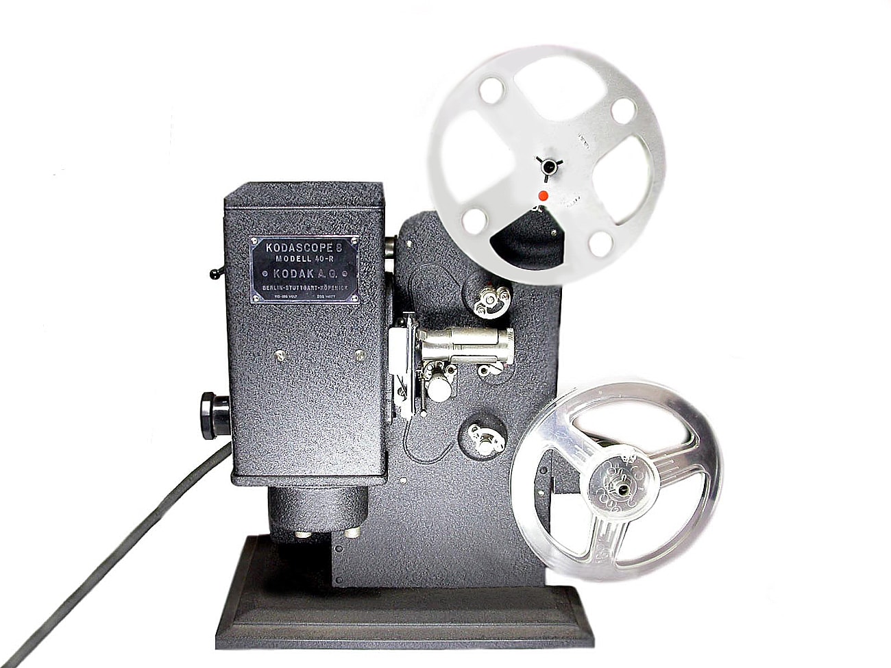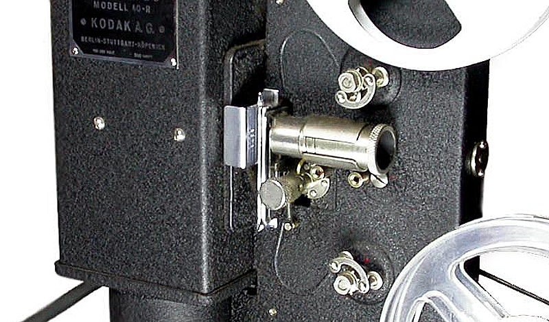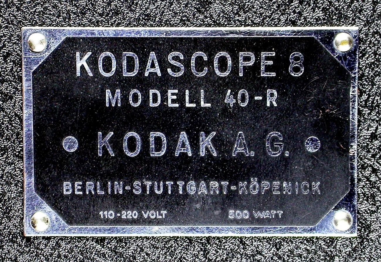 Stummfilmprojektor von Kodak für Normal-8-Filme, Baujahr 1935. Der Filmtransport erfolgt über zwei getrennte einreihige Zahntrommeln mit einer Bildfrequenz von 16 Bildern/Sekunde. Die maximale Spulengröße erlaubt Filmlängen bis 60 Meter. Filmprojektion und Rückspulung sind elektrisch angetrieben bei einer Betriebsspannung von 110 bis 125 Volt, für den Betrieb mit 220 Volt ist ein separater Transformator vorzuschalten, die Projektionslampe hat eine Leistung von 500 Watt und wird per Ventilator gekühlt.