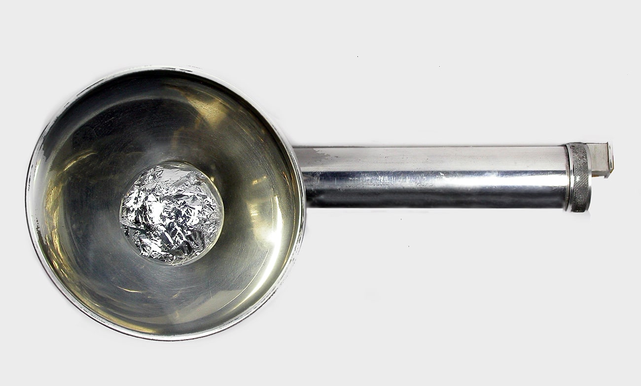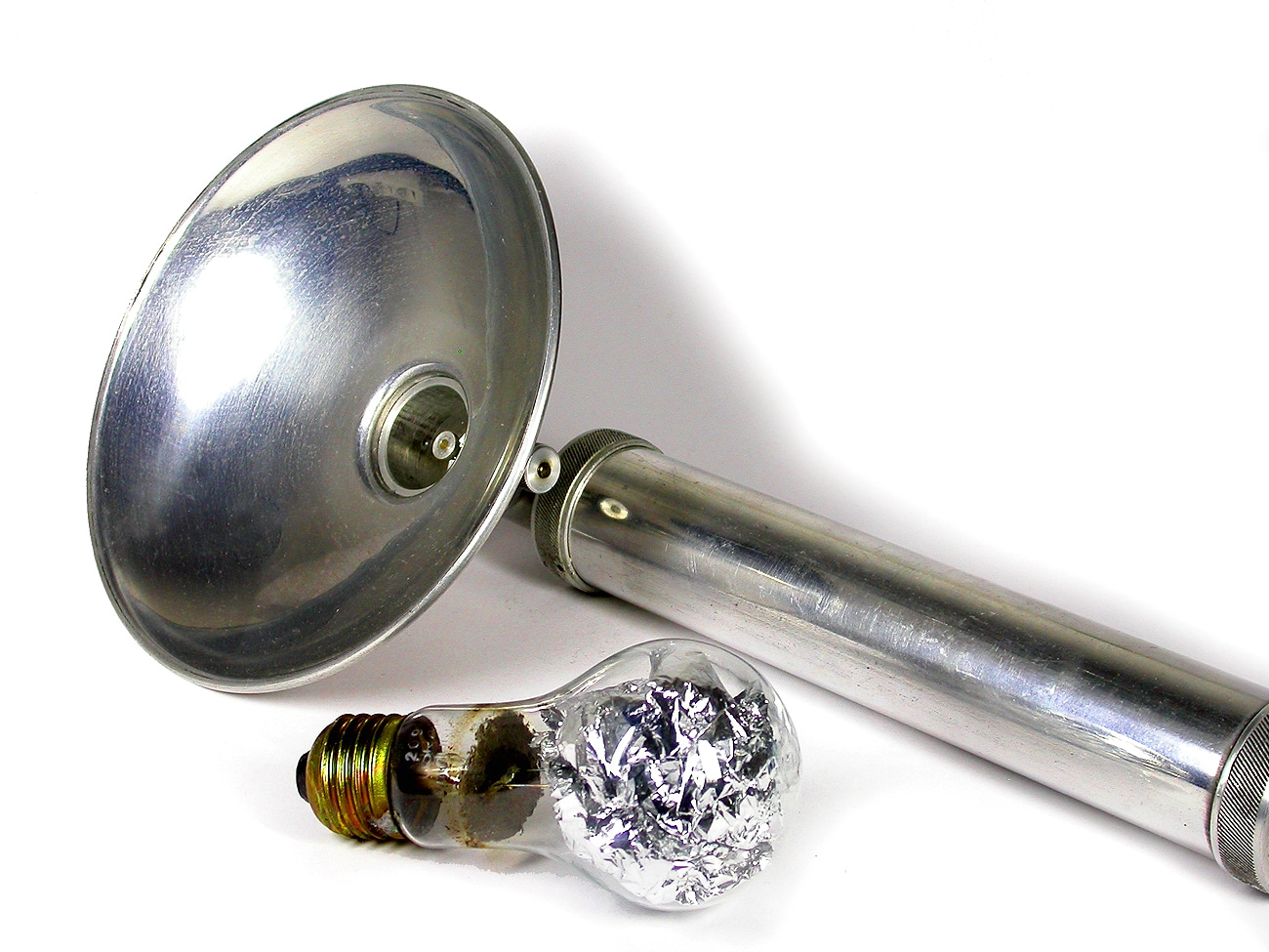 Ein Vorläufer der kleinen Blitzgeräte für Blitzbirnchen: ein klobiges Kolbenblitzgerät aus den 1930er Jahren. Die Blitzlampen hatten noch das E-27-Gewinde wie herkömmliche Glühlampen und sahen auch so aus. Allerdings waren die Glaskolben mit Aluminiumfolien gefüllt, die bei elektrischer Zündung blitzartig verbrannten. Die Blitzlampe wurde aber nicht per Gewinde eingeschraubt, sondern nur eingesteckt und war ebenso schnell per Knopfdruck auszuwerfen. Die Batterien sind im Handgriff untergebracht. Unbekannter Hersteller.