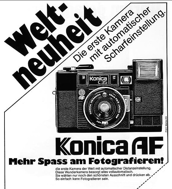 Die laut Eigenwerbung „erste Kamera der Welt mit automatischer Scharfeinstellung“: die Konica C 35 AF, eine Sucherkamera für den Kleinbildfilm 135 (Aufnahmeformat 24 x 36 mm), hergestellt in Japan ab 1978. Objektiv: Konica Hexanon 1:2,8/38 mm (4 Linsen in 3 Gruppen); Autofokus. Die Entfernungskontrolle ist erst nach dem Auslösen möglich (über die Skala neben dem Objektiv), keine manuelle Fokussierungsmöglichkeit. Leuchtrahmensucher mit Parallaxenmarkierungen und Warnanzeige bei Unterbelichtungsgefahr; Markierung für Fokusdetektorfeld. Der Sucher zeigt etwa 75 Prozent des Negativs und rund 80 Prozent vom späteren Dia. Elektronisch gesteuerter Zentralverschluss (1/60 bis 1/250 Sekunde); Programmautomatik. Filmempfindlichkeit von 25 bis 400 ASA/15 bis 27 DIN  jeweils in 1/2 Blendenstufen einstellbar. Eingebautes Elektronenblitzgerät (nach oben ausfahrbar) mit Blitzblendenautomatik. Die Blende ist mit der Entfernungseinstellung gekuppelt. keine Blitzbereitschaftsanzeige im Sucher, keine Batteriekontrolle.