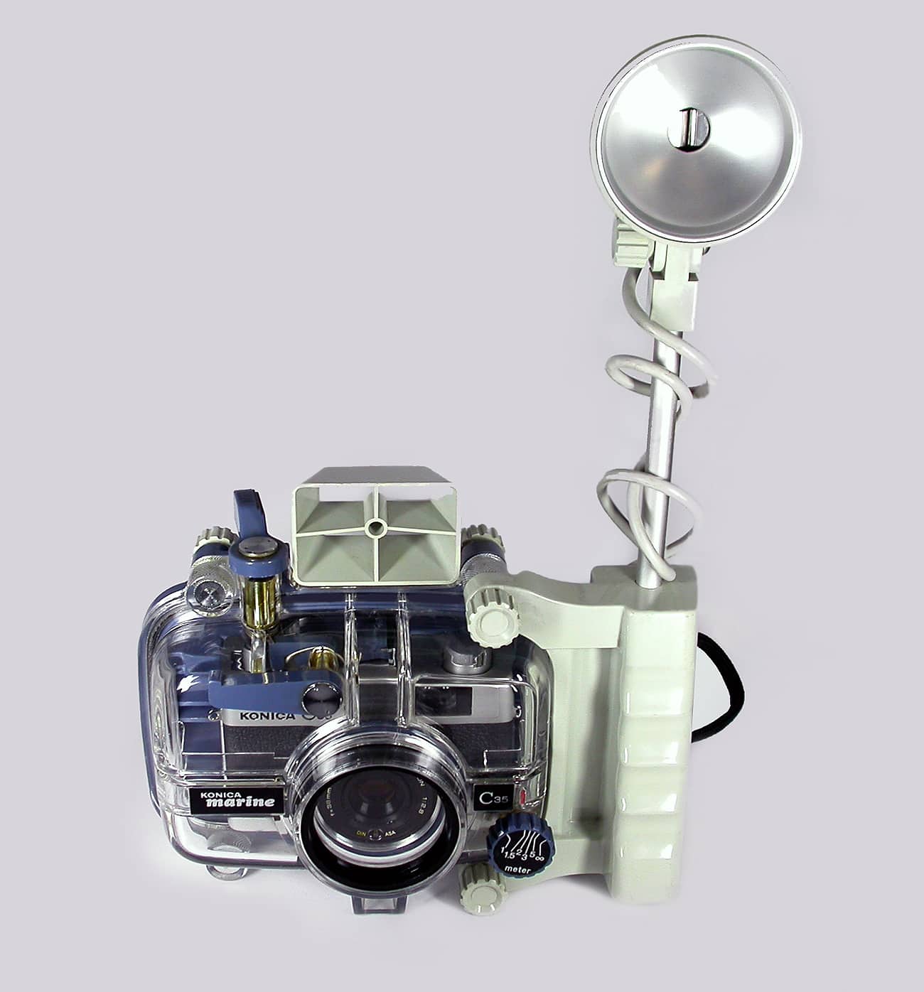 Konica C 35 mit Konica-Unterwassergehäuse Marine: Messsucherkamera (1967) für den Kleinbildfilm 135 (Aufnahmeformat 24 x 36 mm). Manuelle Scharfeinstellung, elektronischer Zentralverschluss Copal B Mat automatischer Programmverschluss mit kombinierten Verschluss-Blendenlamellen hinter dem Objektiv. Verschlusszeit und Blende werden kontinuierlich automatisch eingestellt. Verschlusszeiten von 1/30 bis 1/650 Sekunde, B (nur bei offener Blende). X-Synchronisation bei 1/25 Sekunde für Blitzwürfel, Blitzbirnchen oder Elektronenblitz.