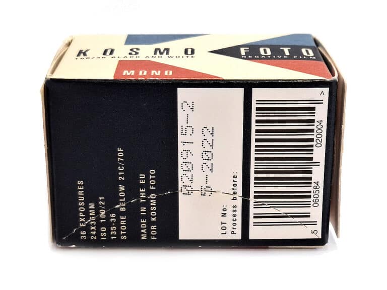 Schwarzweißer Kleinbild-Negativfilm Typ 135, 36 Aufnahmen, ISO 100/21 DIN, keine DX-Kodierung, Negativformat: 24 x 36 mm. Hersteller: unbekannt („Made in the EU“). Vom Verpackungsdesign her könnte es ein Fomapan sein. Zu entwickeln vor Mai 2022.