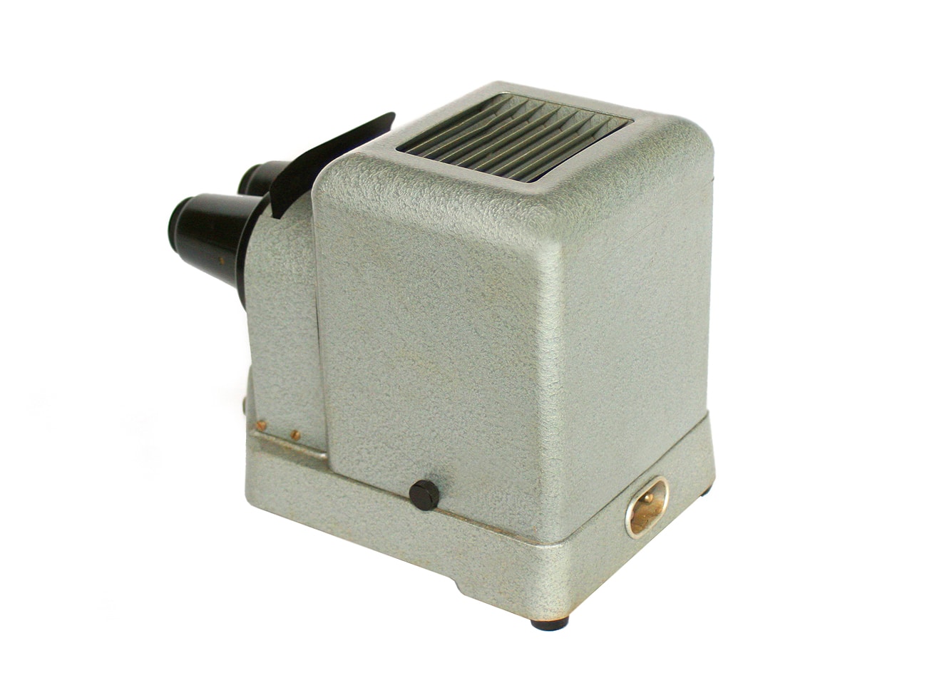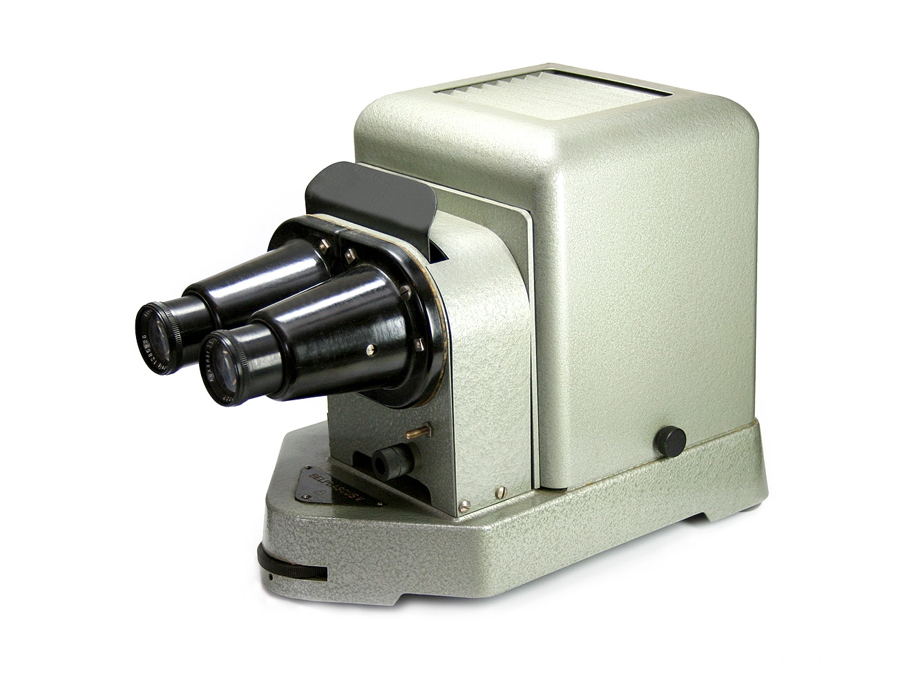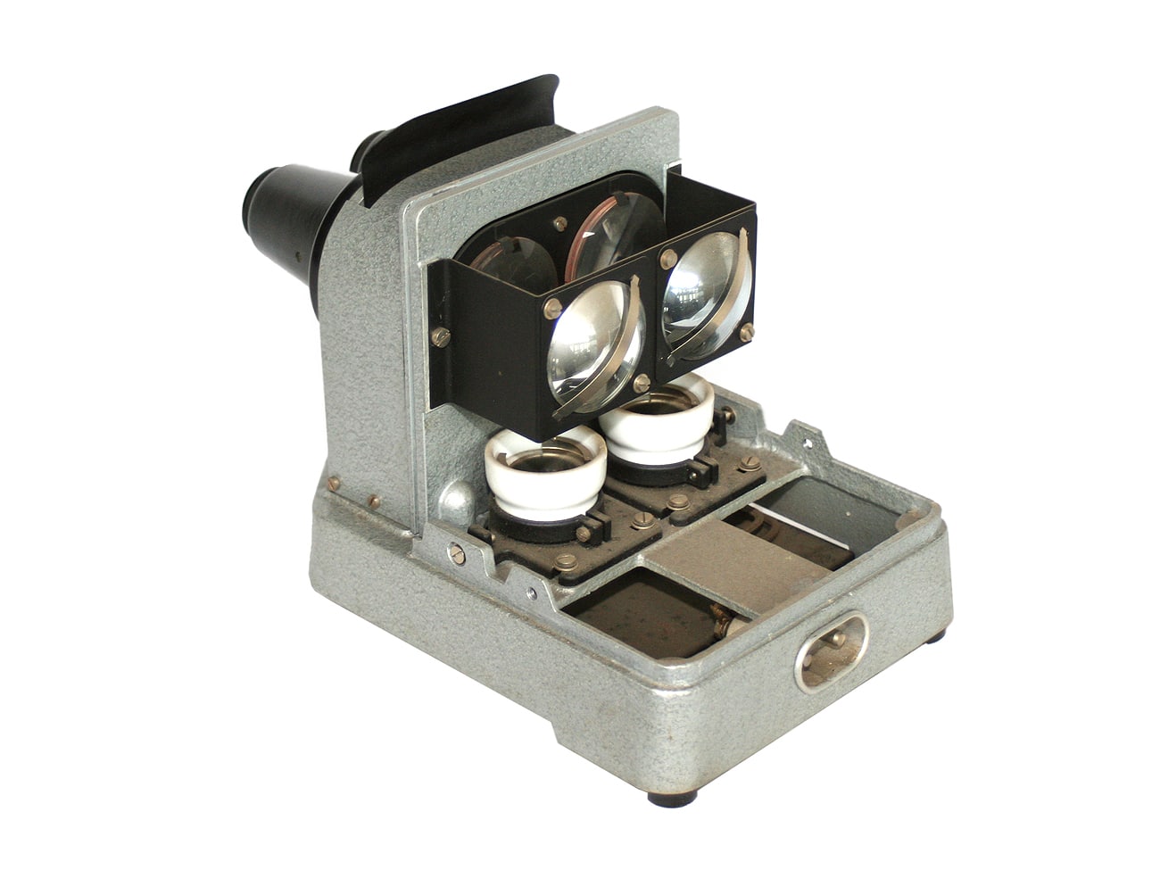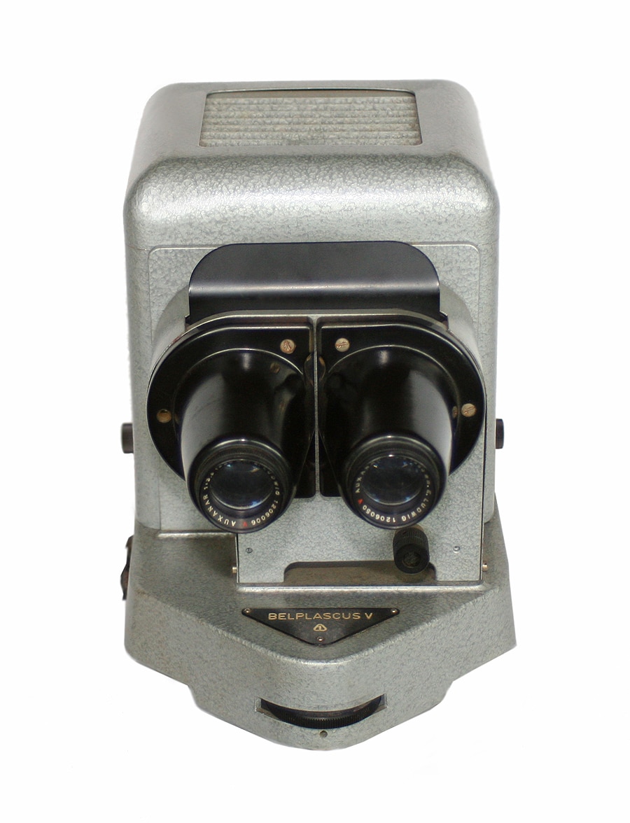 Wichtiger Bestandteil des Belplasca-Stereo-Systems aus der DDR (Belca/K.W./VEB Kamera- und Kinowerke Dresden), etwa 1956: der Projektor Belplascus V für Belplasca-Aufnahmen, die in genormten Belca-Diarähmchen mit den Außenabmessungen 41 x 101 mm gefasst sind.