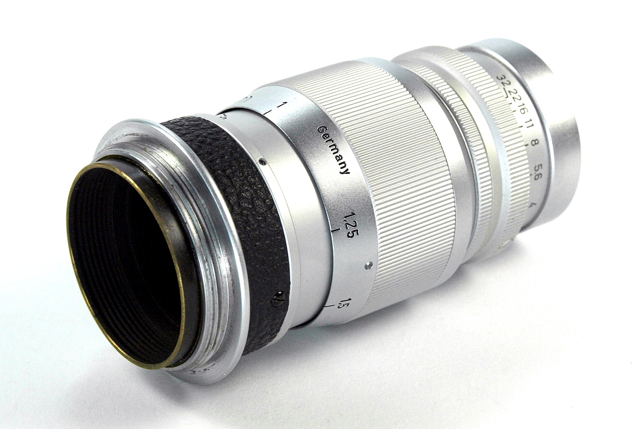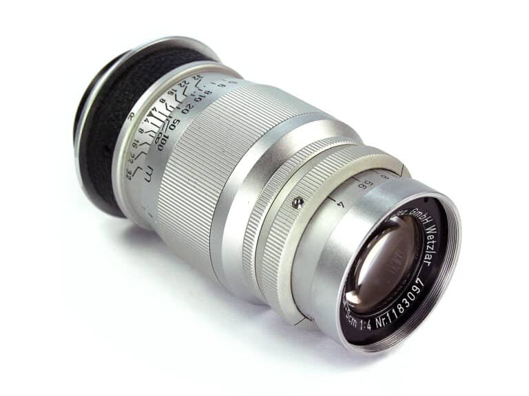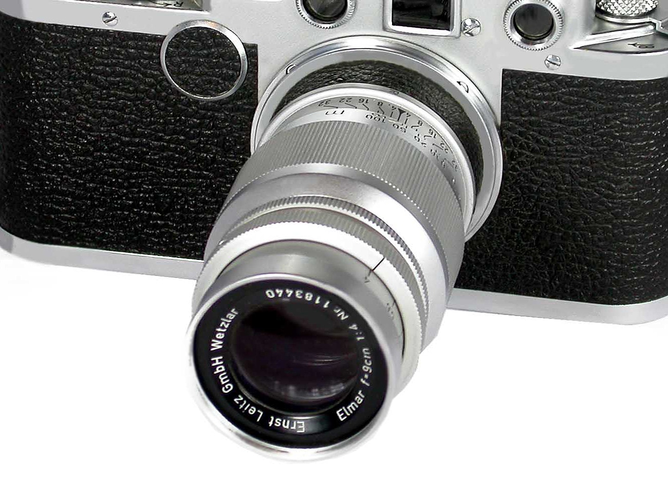 Das Leitz Elmar 1:4/9 cm in der silbernen Nachkiegsvariante von 1954. Das Objektiv hat vier Linsen in drei Gruppen (Tessar-Typ), sämtliche Linsen befinden sich im abschraubbaren vorderen Teil des Objektivs (keine verkürzte Tele-Bauweise). Das etwa 250 Gramm wiegende Elmar kann bis zu einer Nahgrenze von einem Meter scharfgestellt werden, der Bildwinkel beträgt 27 Grad, die kleinste Blende ist 36. Das Objektiv ist weitgehend baugleich mit der Vorkriegsvariante, beide haben ein Messinggehäuse, hier ist es aber vollständig verchromt, die Vorkriegsvariante ist außen überwiegend schwarz.