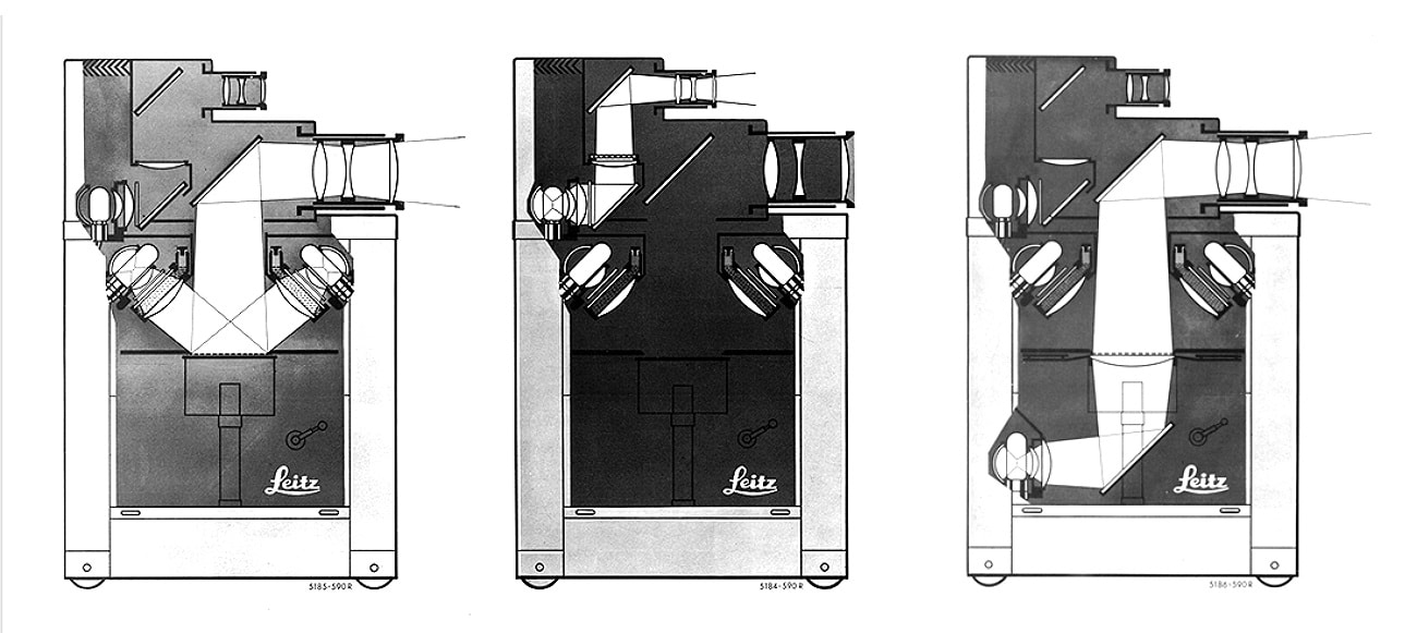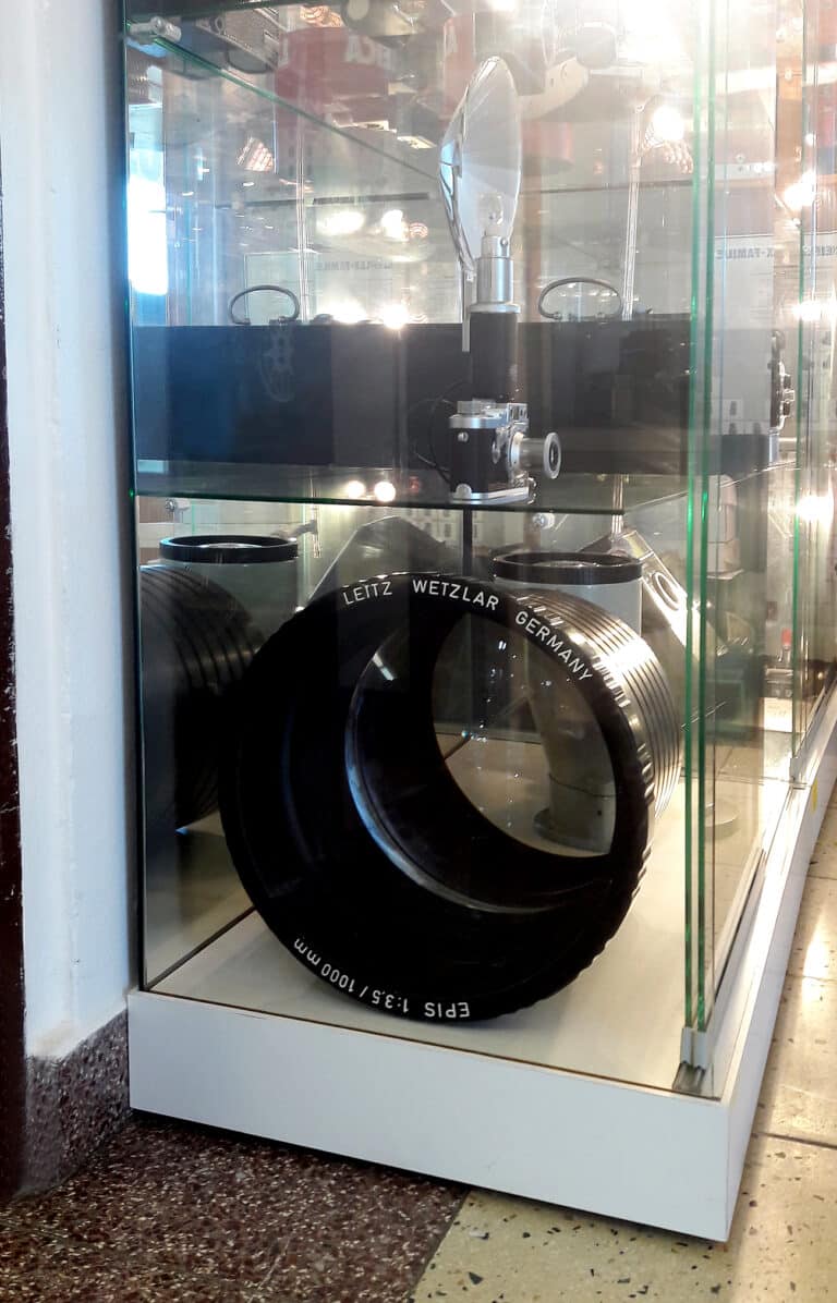 „Live und in Farbe“ im Deutschen Kameramuseum: das Leitz Monsterobjektiv EPIS 1:3,5/1.000 mm (in Worten: eintausend Millimeter Brennweite) in der 2019 umgestalteten Leitz-Vitrine. Gewicht: gut 30 Kilogramm, Durchmesser: etwa 33 cm, Länge: rund 36 cm. Das dazu gehörige Großraum-Epidiaskop III S der Firma Ernst Leitz, Wetzlar – siehe Zeichnungen – mit einem Gewicht von rund 300 kg wurde in den 1950er Jahren gebaut. Das Objektfeld war etwa 20 x 20 cm groß. Die Beleuchtung erfolgte über vier Lampen von je 1.500 Watt, angeschlossen über einen Regeltransformator.