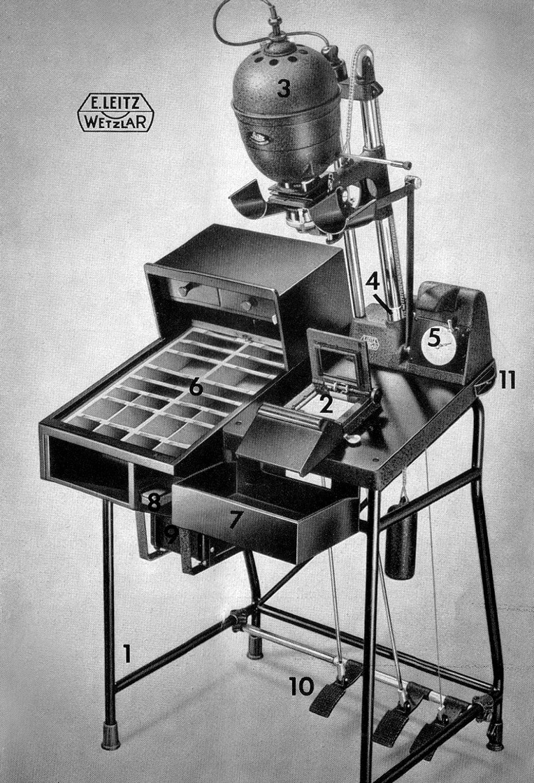 Ein Traum von einem Vergrößerungsapparat: der Leitz Focomator, der 1951 auf den Markt kam. Das hochwertige Gerät aus dem Nachlass eines engagierten Fotoamateurs ist eigentlich ein absolutes Profigerät für Kleinbildnegative 24 x 36 mm. Die Regelgenauigkeit beträgt erstaunliche plus/minus 1 Prozent bei Überspannungen bis 10 Prozent und Unterspannungen bis 20 Prozent im Lichtnetz. Dank einer eingebauten Stempelvorrichtung wurden alle Bilder eines Auftrags auf der Rückseite mit der selben Zahlen-/Buchstabenkombination markiert, sodass sie „beim späteren Sortieren nicht verwechselt werden“ konnten. Es gab zwei Kopierrahmen: einmal mit dem Format 10,5 x 14,8 cm (so genannte Postkarten) und einmal für 7,5 x 10,5 cm, die damals üblichen Amateurbilder. Diese Ausführung hat rechts noch eine elektrische Belichtungssteuerung angebaut.