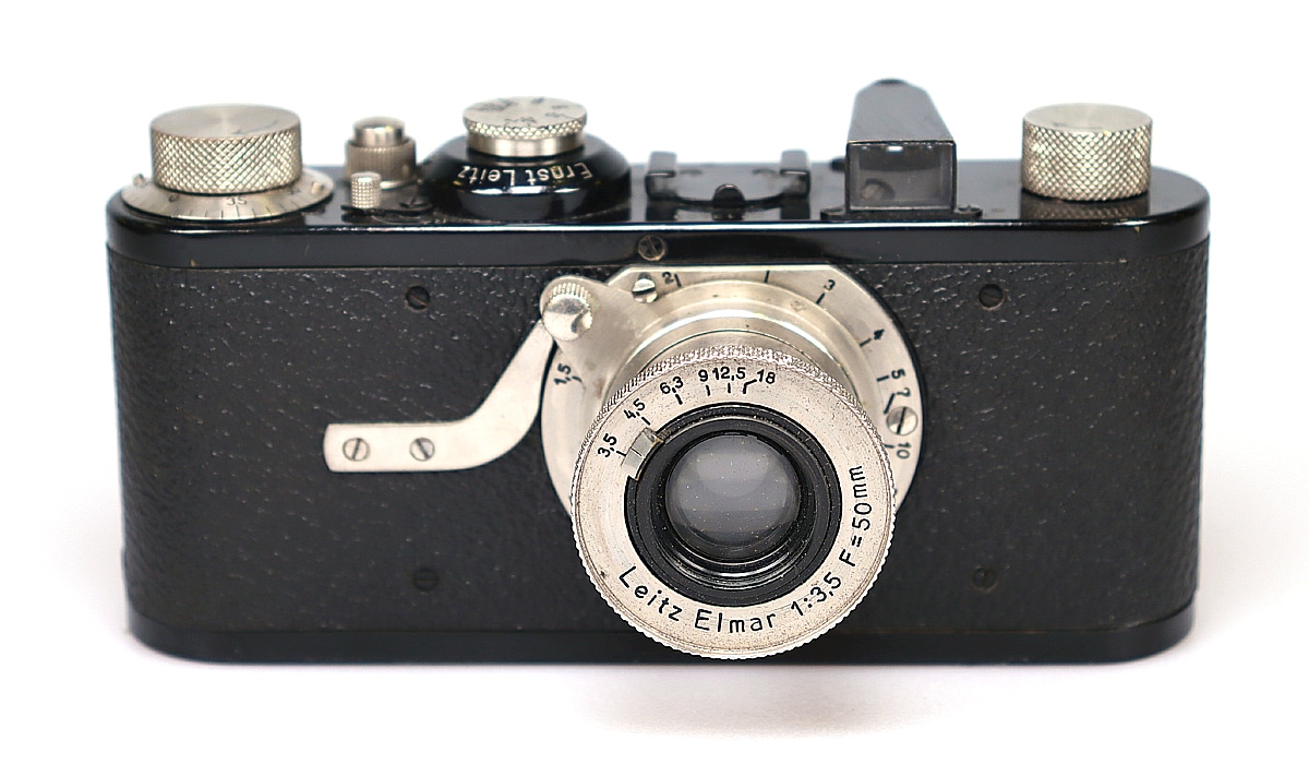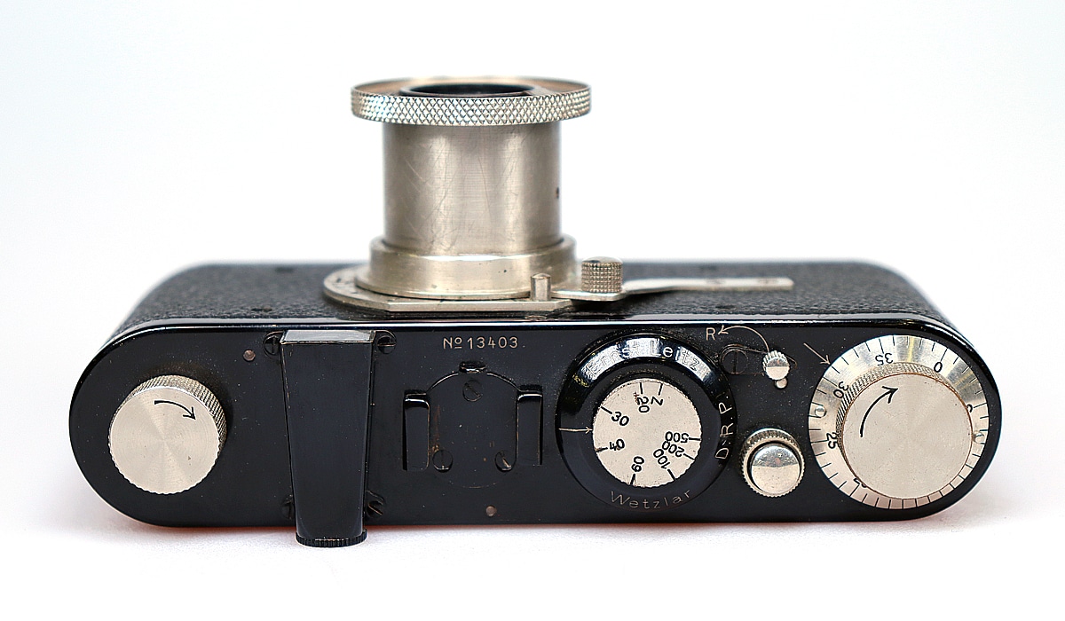 Eine der ältesten Leica-Kameras in unserer Sammlung: die legendäre Leica I (A) mit versenkbarem, aber nicht wechselbarem Objektiv, produziert von 1925 bis 1935 in rund 60.000 Exemplaren. Sucherkamera für den Film 135 (Kleinbildfilm – Aufnahmeformat 24 x 36 mm). Mechanischer Schlitzverschluss (schnellste Verschlusszeit: 1/500 Sekunde). Manuelle Belichtungssteuerung. Hier mit dem Objektiv Leitz Elmar 1:3,5/50 mm. Erste Leica in Serienproduktion, vorgestellt auf der Leipziger Messe 1925. Unser Museumsexemplar stammt ausweislich der Seriennummer aus dem Jahre 1929.