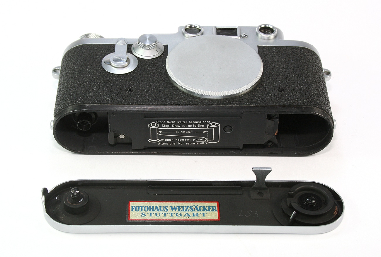 Die Kleinbild-Messsucherkamera Leica IIIf wurde von 1950 bis 1956 gebaut. Dieses Exponat stammt ausweislich der Seriennummer 726331 aus dem Jahre 1954. Das Modell IIIf war die erste Leica mit eingebauter Blitzsynchronisation. Die Verschlusszeiten von 1 bis 1/1.000 Sekunde sind noch in Leica-typischen Abstufungen (z.B.: 1/40, 1/100, 1/200 und 1/500 Sekunde) ausgeführt. 1952 wurde der Verschluss auf die internationale Zeitenreihe umgestellt. Die Kontaktzahlen wurden dann rot graviert (ab Seriennummer 615000). Ab 1954 gab es die IIIf auch mit Vorlaufwerk (Bild) von etwa 12 Sekunden Dauer. Die Filmmerkscheibe befindet sich im Transportknopf.