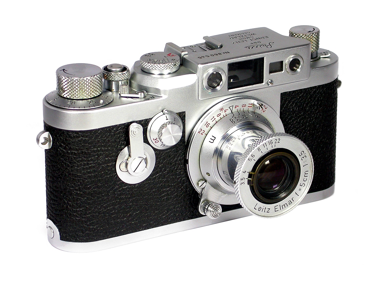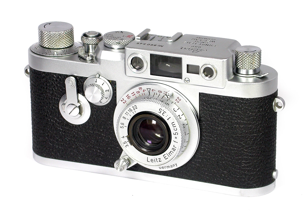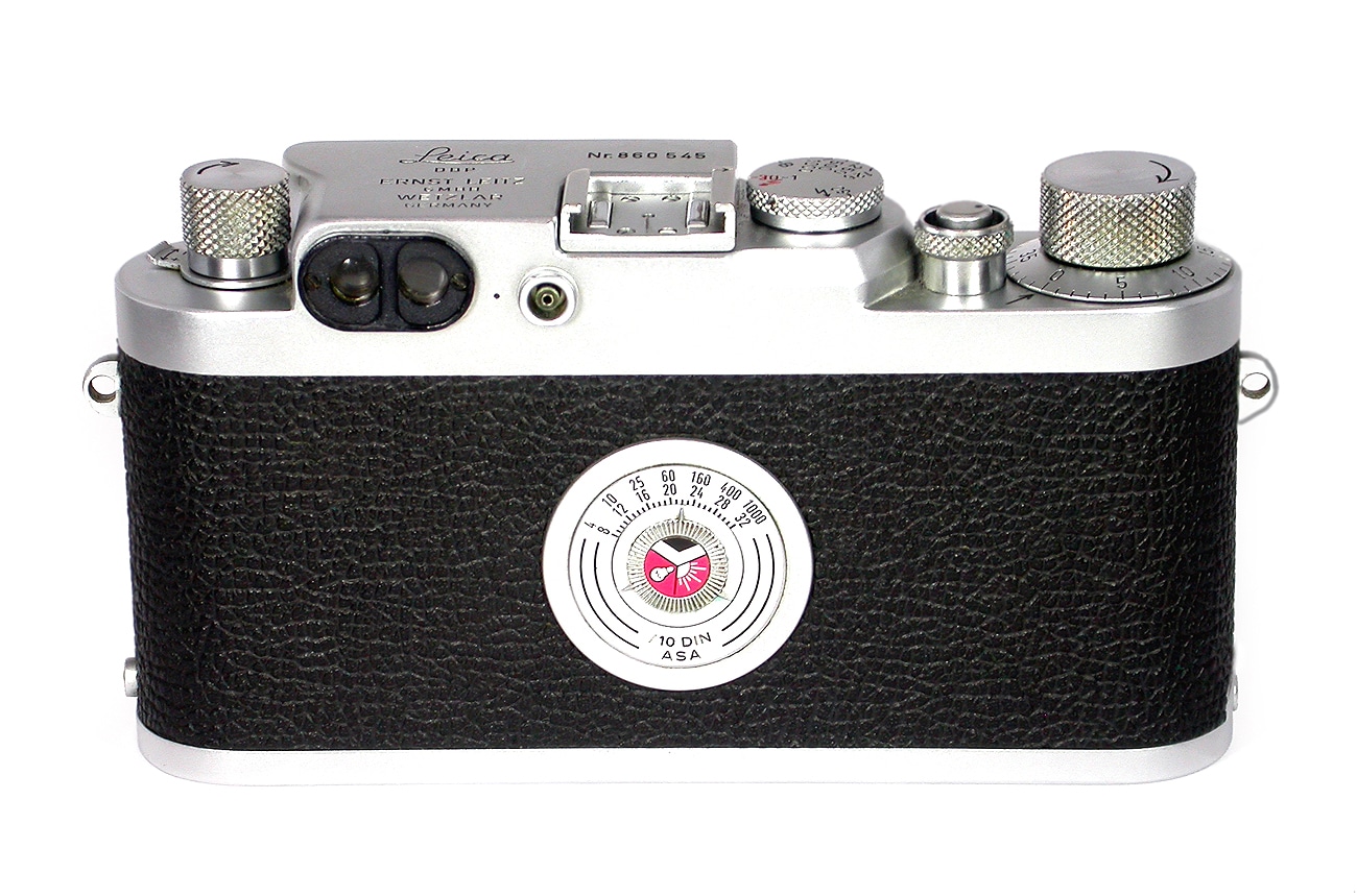 Eine der legendären und heute noch begehrten Leica-Messsucherkameras für den Kleinbildfilm 135 (Negativformat 24 x 36 mm): die IIIg, die von 1957 bis 1960 gebaut wurde. Dieses Exponat stammt ausweislich der Seriennummer aus dem Jahre 1957. Das Modell IIIg unterscheidet sich in vier technischen Einzelheiten vom Vorgängermodell IIIf. Die IIIg besitzt einen neuen Leuchtrahmensucher mit automatischem Parallaxausgleich. Eine weiße Umrandungslinie zeigt jeweils das Bildfeld des 5-cm-Normalobjektives an. Innerhalb dieses Rahmens sind vier Dreieck-Marken sichtbar. Sie zeigen das Bildfeld für 90-mm-Objektive. Die Verschlusszeiten von 1 bis 1/1.000 Sekunde sind der geometrischen Reihe angeglichen. Die Synchronisierung ist automatisiert. Die Kontaktzahlen werden nicht mehr benötigt. Der Hebel für den Dioptrienausgleich hat Markierungen für + und -. Die Filmmerkscheibe befindet sich jetzt auf der Kamerarückseite. Die IIIg wurde mit folgender Objektivbestückung (Schraubgewinde M 39) angeboten: dem Elmar 1:3,5/50 mm (Bild), dem Summicron 1:2/50 mm und dem Elmar 1:2,8/50 mm, das unter weitgehender Verwendung von Lanthan-Krongläsern errechnet wurde.