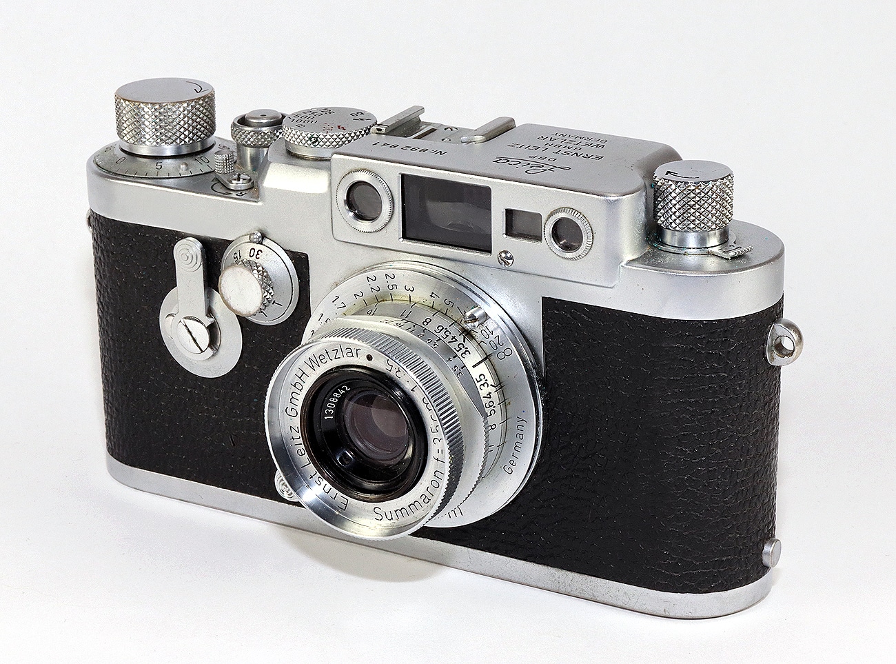 Eine der legendären und heute noch begehrten Leica-Messsucherkameras für den Kleinbildfilm 135 (Negativformat 24 x 36 mm): die IIIg, die von 1957 bis 1960 gebaut wurde. Die Verschlusszeiten von 1 bis 1/1.000 Sekunde sind der geometrischen Reihe angeglichen. Die Kamera im Bild ist ausgestattet mit dem Weitwinkelobjektiv Leitz Summaron 1:3,5/35 mm.