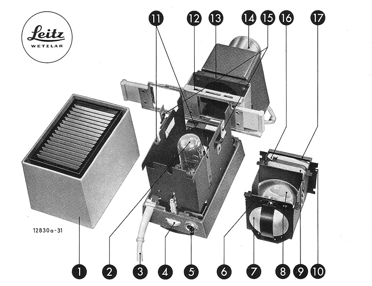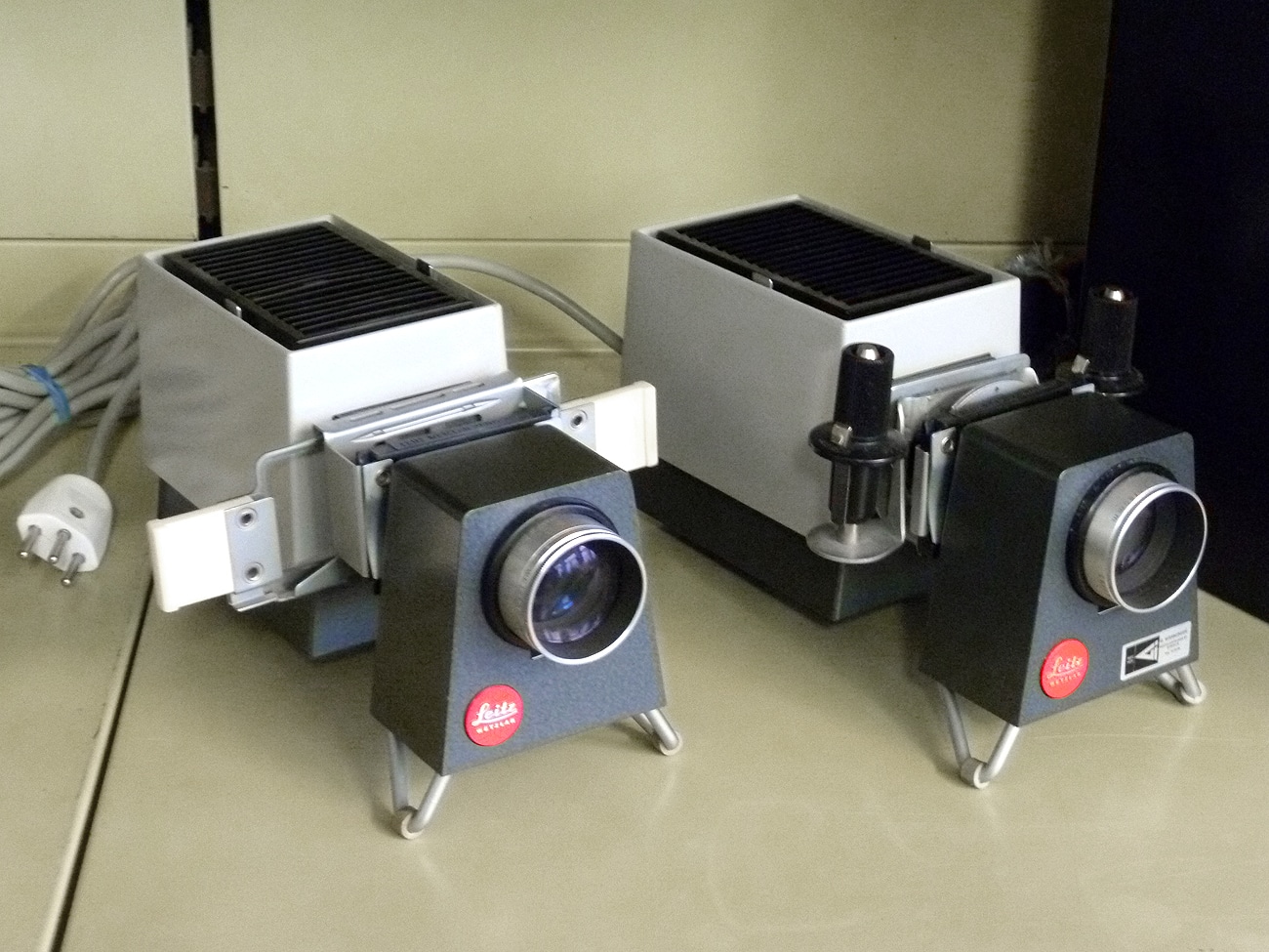 Der sehr erfolgreiche Leitz Prado 150, der erstmals vor dem Krieg als VIIIc erschienen war, wurde 1963 durch den Kleinbild-Projektor Pradix ersetzt. Er ist leicht und sehr kompakt und ein übergroßer asphärischer Kondensor sorgt für verbesserte Ausleuchtung mit Objektiven von 50 bis 100 mm in Verbindung mit einer 150-Watt-Lampe (230 Volt). Hier mit Objektiv Leitz Elmaron 1:2,8/85 mm. Der Diaschieber hat an beiden Enden einen weißen Plastikgriff und ist zum besseren Transport und Aufbewahren schwenkbar und abnehmbar. Hinten, neben dem Einschalter, ist ein Rändelrad zur Verstellung der Projektionsneigung angebracht. Am Boden besitzt der Pradix ein Stativgewinde. Es gibt auch eine Bildbandführung zum Pradix.