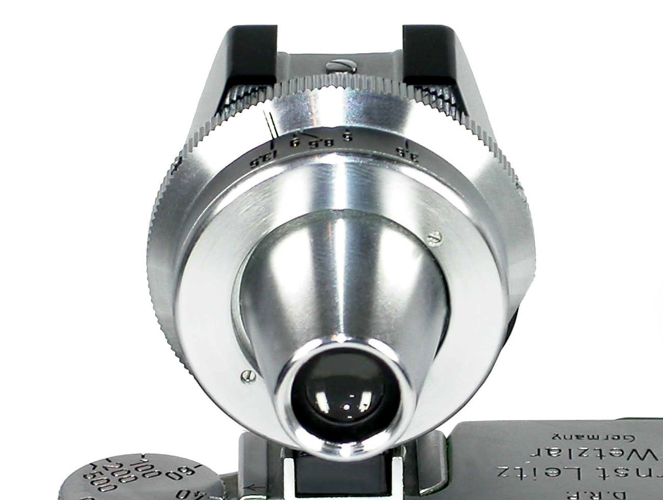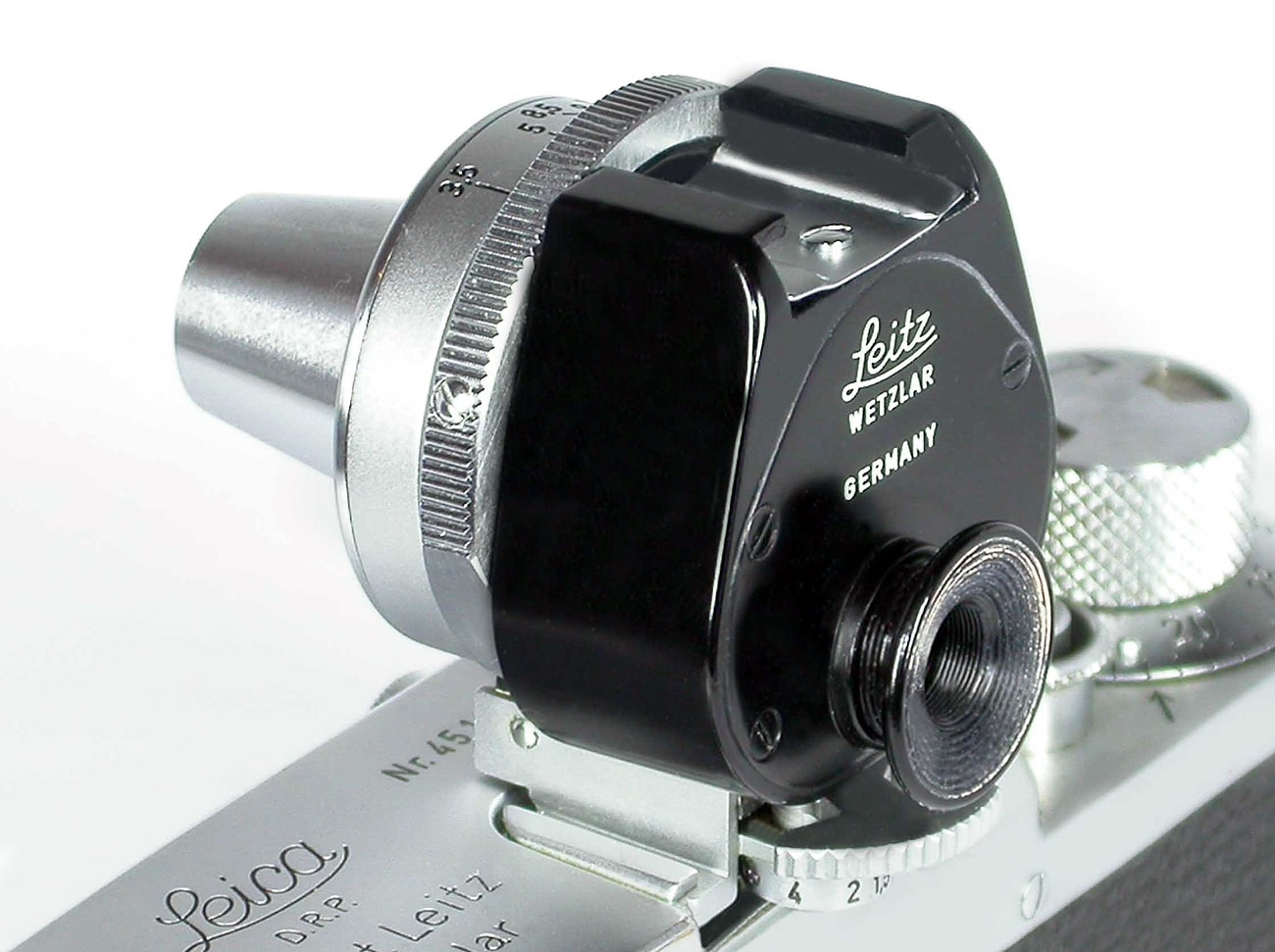 Der Leitz-Universalsucher vom Typ VIOOH (12000W) für die Leica (Brennweiten: 3,5 – 5 – 8,5 – 9 – 13,5 cm) ersetzte den VIDOM und war von 1939 bis 1963 im Angebot. Es gab ihn in verschiedenen Ausführungen (hier nicht mit runden oder „Lyra-förmigen“, sondern mit geraden Seiten). Oben ist der Zubehörschuh zu erkennen, unten Ziffern des Parallaxenausgleichs.