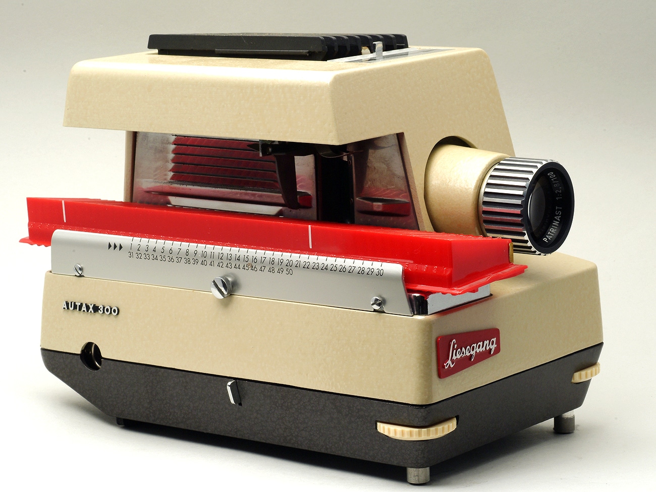 Gewichtiger automatischer Diaprojektor der Ed. Liesegang oHG, Düsseldorf, Ende der 1950er/Anfang der 1960er Jahre. Ausgelegt speziell für Liesegang-Magazine (bis 50 Kleinbild-Dias). Kabelfernbedienung, auch manuelle Einzelbildschaltung per Hebel an der Oberseite. Objektiv: Liesegang Patrinast 1:2,8/100 mm (auch 85 mm verfügbar). Leuchtmittel: Schmalfilmlampe mit Stiftsockel 300 Watt, Kühlgebläse. Elektrischer Anschlusswert gesamt: 350 Watt. Eine Variante mit 500 Watt Lampe war unter der Bezeichnung Fantax 500 verfügbar und auch für Rundmagazine geeignet.