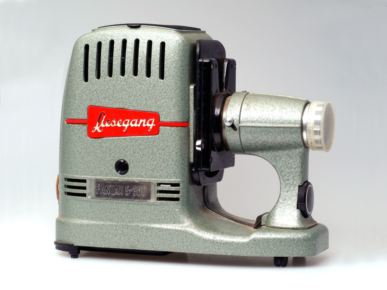 Manueller Diaprojektor von Ed. Liesegang oHG, Düsseldorf, für Kleinbildformat 24 x 36 mm, ca. 1957/1958. Die Konstruktion erlaubt drei verschiedene Möglichkeiten der Diaführung: manuelle Diazufuhr (5 x 5 cm) in schwenkbarem Einzelrahmen (Museumsmodell), ebenfalls schwenkbarer Filmrollenhalter, ansetzbarer Magazinschacht mit manueller Bedienung für Liesegang-Magazine. Objektiv: Liesegang Sankar 1:2,5/85 mm, weitere Objektivvarianten waren verfügbar. Stromanschluss: 215-240 Volt/350 Watt, Lampe 300 Watt, Kühlgebläse. Anstelle des eingesetzten roten Firmenlogos waren auch Varianten mit direkt eingegossenem Schriftzug im Markt, ebenso eine äußerlich baugleiche Version mit 150 Watt-Lampe (Fantax 5-150).