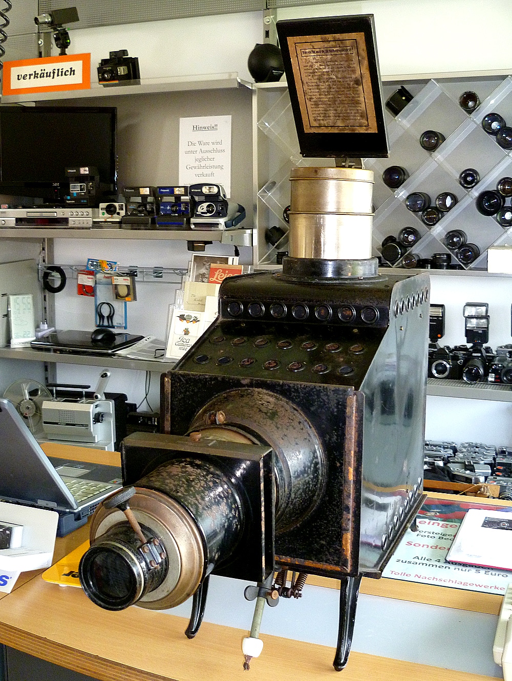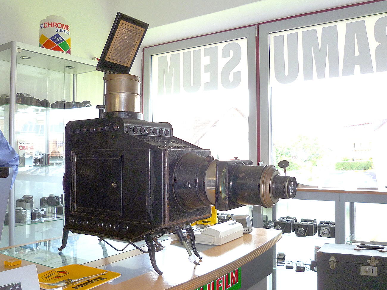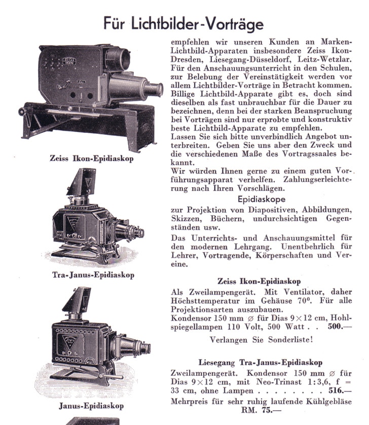 Ein wundervoller Projektor der Firma Liesegang, etwa 1926, mit dem sowohl Großbilddias als auch bildhafte Vorlagen (Bücher, Fotos, Landkarten) projiziert werden können. Die horizontale Projektionsachse ist für Dias vorgesehen, der Einschub in dem erweiterten Tubus ist für Großdias bis zu 9 x 12 cm dimensioniert, die in speziellen Holzrahmen für Zweifachschieber gefasst sein mussten. Die vertikale Projektionsachse ist mit einem 330-mm-Objektiv ausgestattet, das von einer unten eingelegten Papiervorlage eine Fläche von etwa 16 x 16 cm über den oben angeordneten Spiegel horizontal auf die Leinwand projiziert. Je nach Anforderung standen verschiedene Objektive zur Auswahl. Erste Ausführungen waren mit nur einer Lampe für beide Projektionsarten ausgerüstet, ein zusätzliches Gehäuse mit einer zweiten Lampe und Reflektor konnte an der hinteren Gehäuseseite nachgerüstet werden.