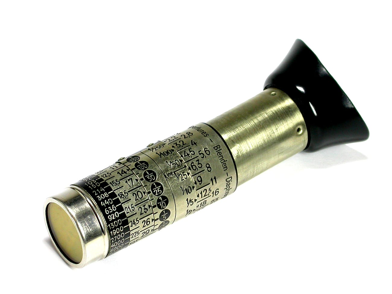 Einer von vielen: ein optischer Belichtungsmesser aus Deutschland (Firma Dr. Wilhelm Schlichter, Freiburg), gebaut 1933 – leider war bei unserem Exemplar nur eine Bedienungsanleitung in französischer Sprache ohne Herstellerangabe dabei. Aber das Prinzip ist bekannt: Durchschauen, dann sieht man hoffentlich ein paar Zahlen. Die Zahl, die man gerade noch erkennen kann, ablesen und am mittleren Ring außen einstellen. So kann man eine passende Zeit-/Blendenkombinationen ermitteln und auf die Kamera übertragen.