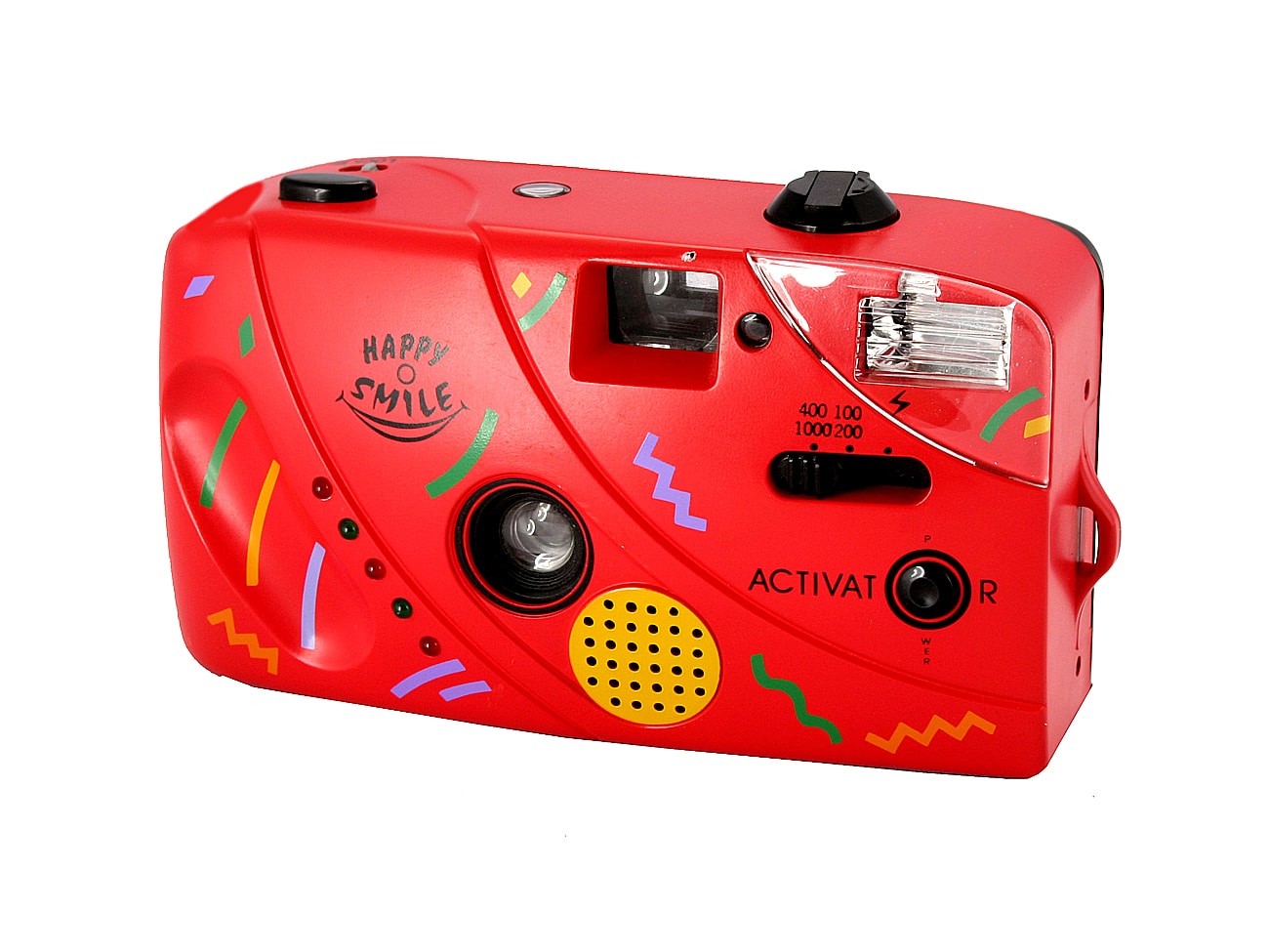 Etwas für Kinder oder für das Kind im Manne: Die Happy Smile taugt zwar durchaus zum Fotografieren, sogar mit eingebautem Elektronenblitz, aber mehr Spaß macht es, den „Activator“-Knopf zu drücken. Dann ertönt, wenn man oft genug drückt, ein halbes Dutzend elektronischer Geräusche des Computerspielzeitalters aus dem gelben Minilautsprecher. Gewehrfeuer, Klingeltöne usw. Kompakte Sucherkamera für den Kleinbildfilm 135 (Aufnahmeformat 24 x 36 mm), hergestellt Mitte der 1990er Jahre. Objektiv ohne Bezeichnung, aber wahrscheinlich mit den Werten 1:5,6/35 mm; Fixfokus. Leuchtrahmensucher. Elektronisch gesteuerter Zentralverschluss; Zeitautomatik. Eingebauter Elektronenblitz. Kunststoffgehäuse in poppiger Farbgebung.