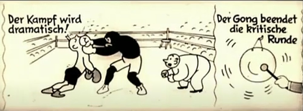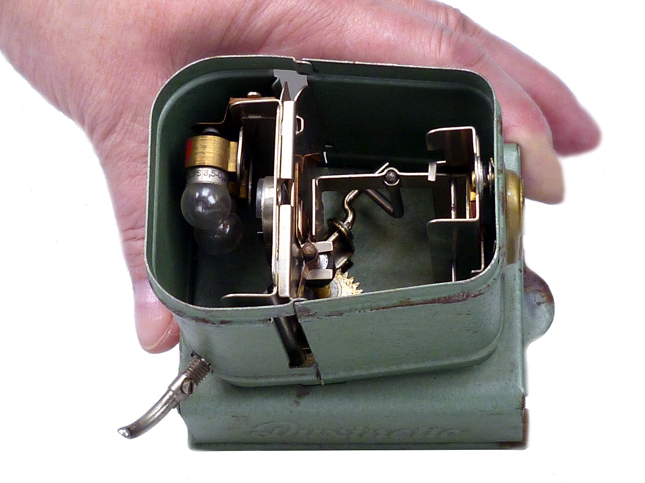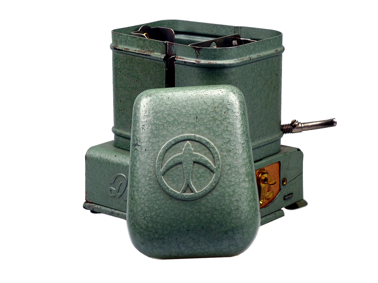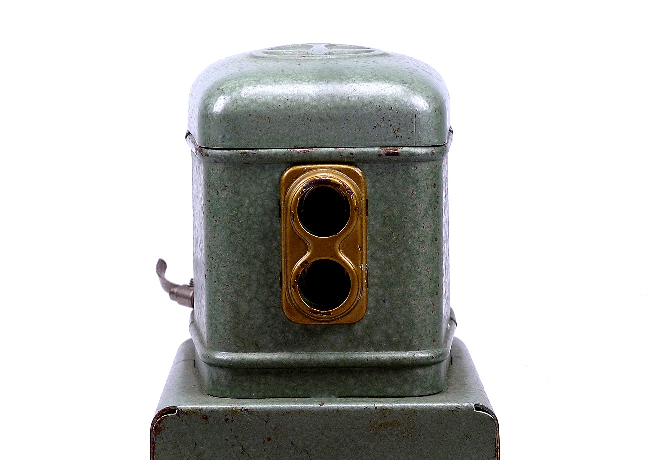 In diesem Kinderprojektor von 1952 der Firma Markes & Co. kommt das 1932 patentierte Zwei-Phasen-System zum Einsatz. Auf dem horizontal per Handkurbel bewegten 35 mm-Film sind in zwei Reihen übereinander die Szenen angeordnet, die wechselweise durch die beiden Objektive projiziert werden, angesteuert durch eine vertikal bewegte Blende. Die exakt zueinander positionierten Szenen zeigen unterschiedliche Bewegungspositionen, zwischen denen hin- und her geschaltet wird, während der Film kontinuierlich an dem Bildfenster vorbeiläuft. Dadurch entsteht der Eindruck einer Bewegung. Die Filmstreifen sind jeweils etwa 25 cm lang.