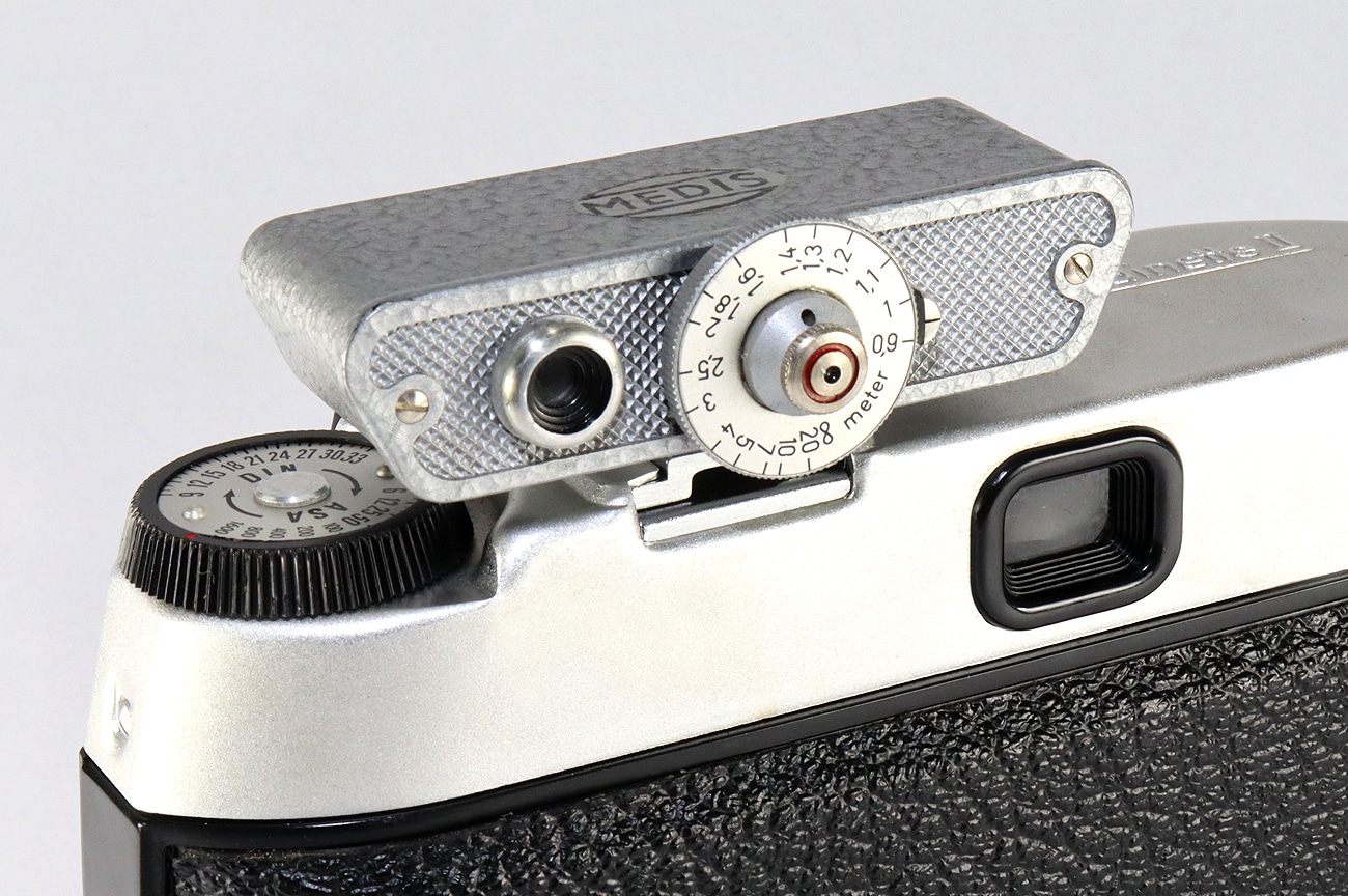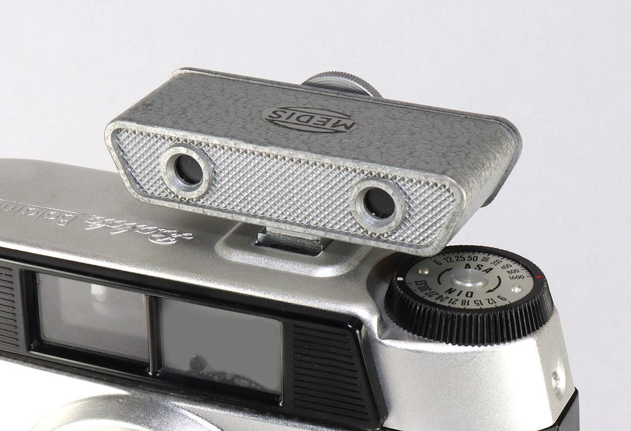 Aufsteckentfernungsmesser des deutschen Herstellers Medis, vermutlich 1950er Jahre. Seltene Ausführung mit abgeschrägten Seiten. Schwere Metallausführung (48 Gramm), graue Hammerschlaglackierung, etwa 65 x 35 x 25 mm groß. Es gab das Gerät auch mit schwarzer Frontplatte. Für den Zubehörschuh von Sucherkameras (hier auf einer Balda, Ansicht der beiden vorderen Messfenster). Entfernungsmessung von 90 Zentimetern bis unendlich. Das Gehäuse besteht aus zwei Teilen: dem eigentlichen Gehäuse und dem einschiebbaren Rückteil mit dem Einstellrad und dem Sucherokular.