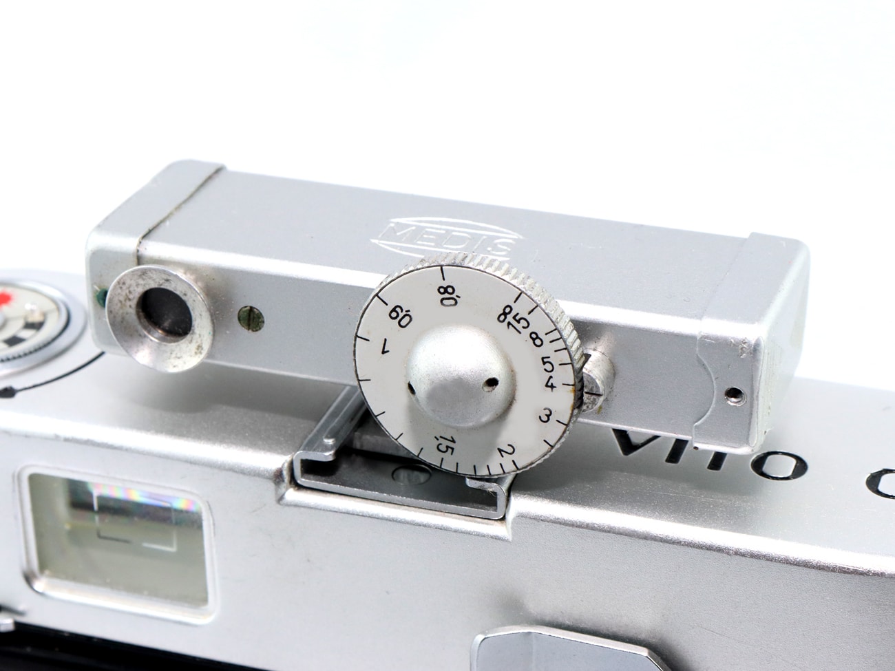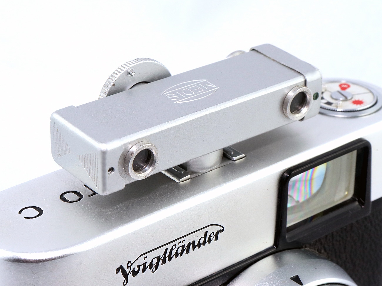 Aufsteckentfernungsmesser des deutschen Herstellers Medis, vermutlich 1950er Jahre. Seltene Ausführung mit geraden, aber geriffelten Seiten. Leichte Aluminiumausführung (30 Gramm), etwa 64 x 28 x 25 mm groß. Für den Zubehörschuh von Sucherkameras (hier auf einer Voigtländer, Ansicht der beiden vorderen Messfenster). Entfernungsmessung von 80 Zentimetern bis unendlich. Das Gehäuse besteht aus drei Teilen: dem eigentlichen Gehäuse mit der Optik und dem Einstellrad und den beiden aufgesteckten seitlichen Kappen. Wenn man genau hinschaut erkennt man die eingeprägten Rillen in der seitlichen Abdeckkappe. Der Zubehörschuh ist angeschraubt. Im Museum mit brauner Original-Ledertasche.