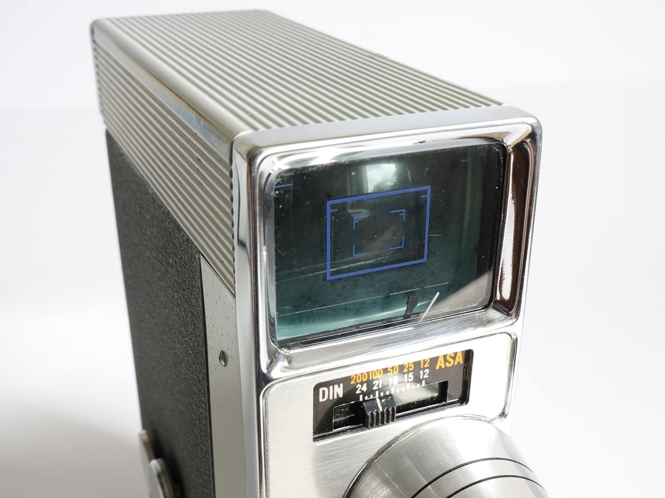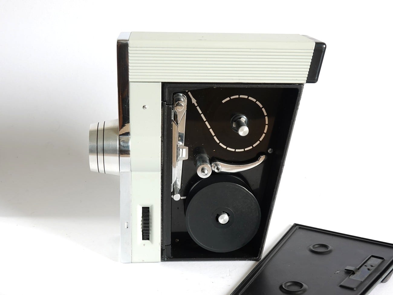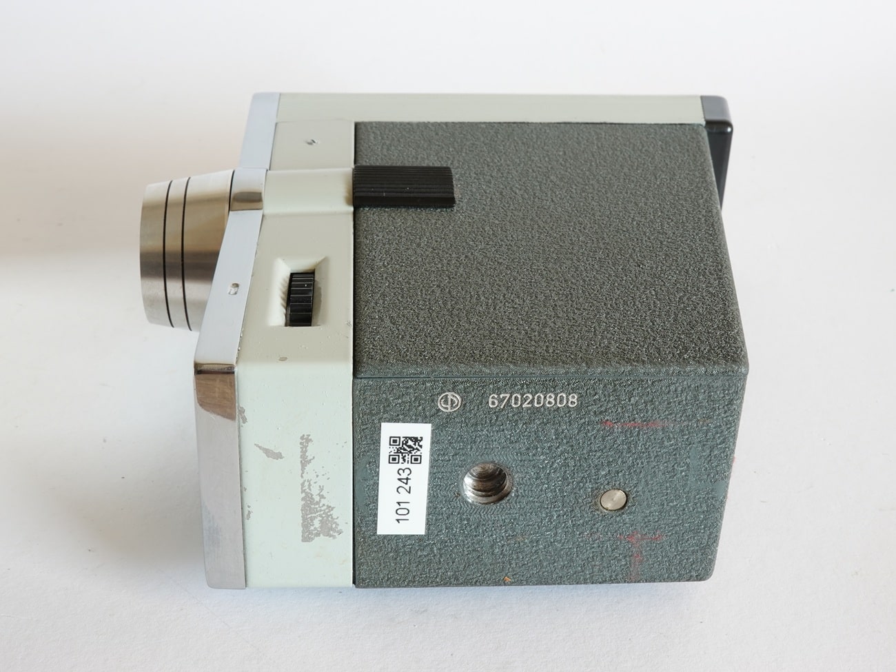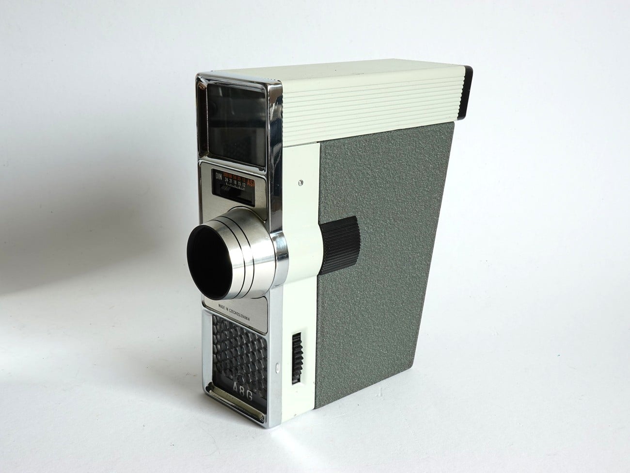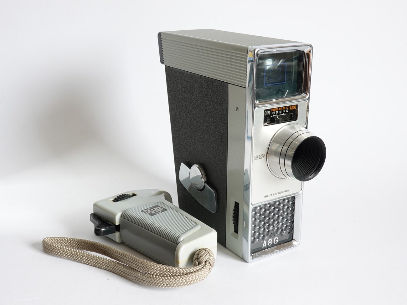 Schmalfilmkamera für das Aufnahmeformat Doppel-8, hergestellt in der Tschechoslowakei, 1964. Objektiv: Meopta Mirar 2,8/12,5 mm, Seriennummer 80120, Fixfokus. Großer Fernrohrsucher. Federwerksantrieb (Einzelbild; 16 Bilder pro Sekunde). Eingebauter Belichtungsmesser mit Selenzelle, Anzeige im Sucher; manuelle Belichtungssteuerung mittels Nachführmessung. Anschlüsse für Stativ und Drahtauslöser. Im Museum mit abnehmbarem Handgriff und Bereitschaftstasche.