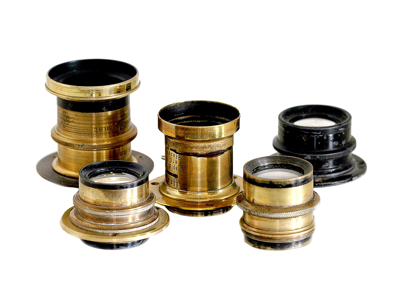 Beispiele für Objektive für Plattenkameras beziehungsweise Reisekameras. Verschiedene Hersteller. Rechts hinten: ebenfalls ein Messingobjektiv, nur schwarz lackiert, was später bei manchen Firmen in Mode kam.