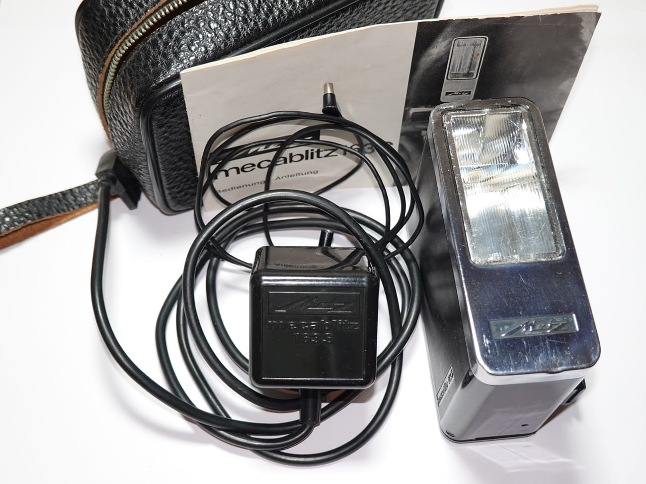 Elektronenblitz mit eingebautem NC-Akku, separatem Netzgerät, Synchronkabel und Aufbewahrungstasche. Der Blitz kann über den Mittenkontakt im Steckfuß oder über das Synchronkabel (1 Meter) gezündet werden. Der Steckfuß ist schwenkbar; die benötigte Blende wird mit dem mechanischen Blendenrechner auf der Rückseite ermittelt. Leitzahl bei einem 18-DIN-Film ist 20; Blitzdauer etwa 1/1.000 Sekunde, Leuchtwinkel 65° (Weitwinkel), etwa 65 Blitze pro Akkuladung, erneute Blitzbereitschaft nach 8 Sekunden.