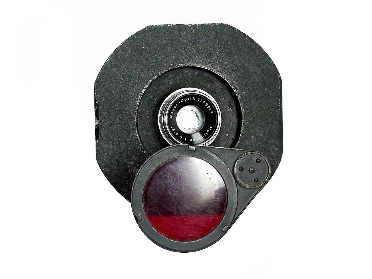 Bei dem Objektiv handelt es sich um ein Helioplan 1:4,5/75 mm von Meyer Optik Görlitz, ein höherwertiges Vergrößerungsobjektiv, das in Vergrößerungsgeräten der Firma Filmosto Dresden (später VEB Aspecta Dresden, schließlich VEB Pentacon) verwendet wurde. Helioplane sind in der Linsenkonstruktion symmetrisch aufgebaut (vier Linsen in vier Gruppen). Als Vergrößerungsobjektive eignen sie sich besonders gut wegen ihrer hohen Verzeichnungsfreiheit.