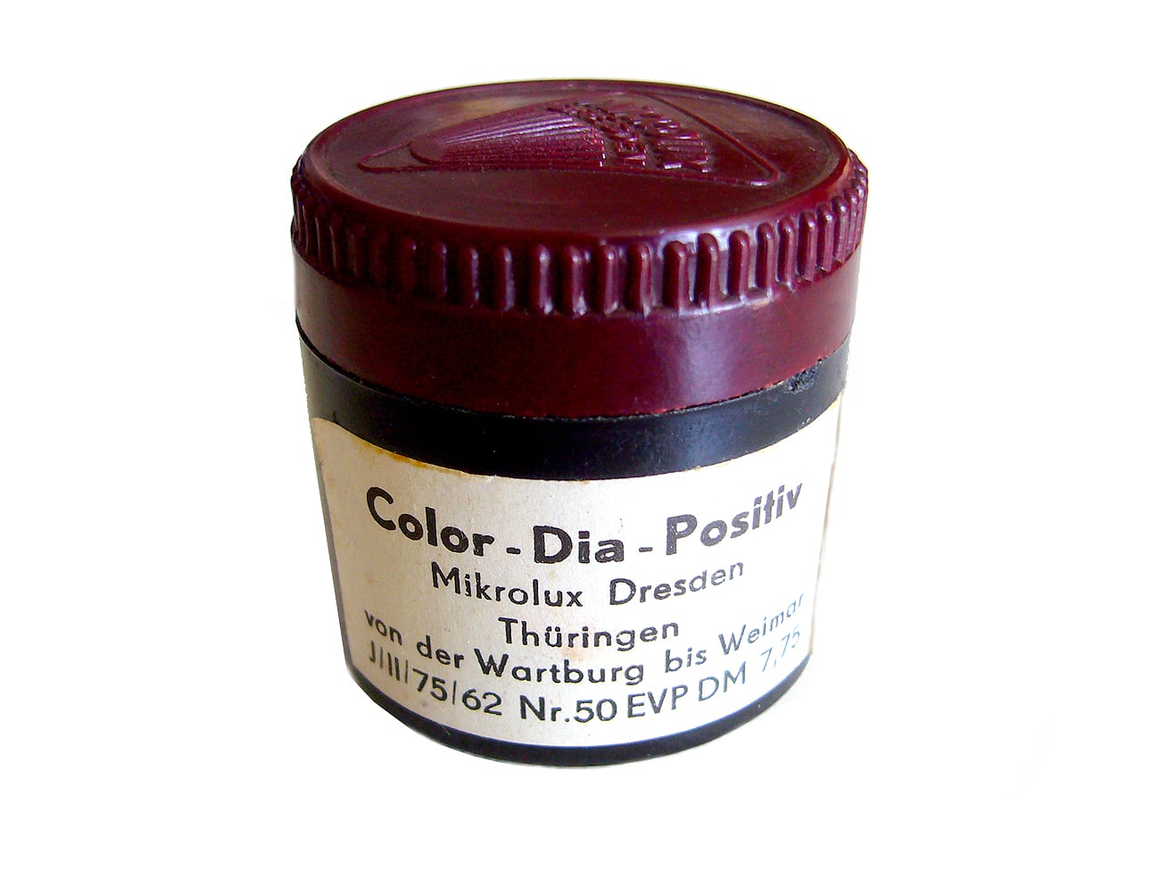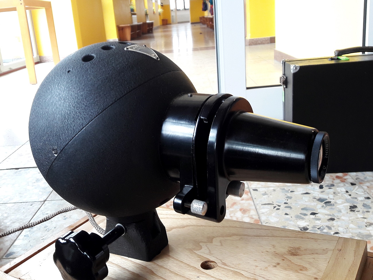 Kleinbildiaprojektor von Mikrolux, Dresden, in auffälliger Kugelform, um 1954. Das Gehäuse mit eingebautem Trafo besteht aus schwarz lackiertem Aluminium, die Objektivaufnahme und die Filmbühne sind aus Bakelit. Die Filmbühne (die auf diesem Foto fehlt) ist gegen eine Bildbandführung austauschbar. Die große Rändelstellschraube am Fuß (im Bild links unten) dient dazu, den Projektor nach dem Verstellen der Neigung in einer Position zu fixieren. Größe etwa 27 x 16 x 24 cm, Gewicht: 2,5 kg. Lampe: 6 Volt/50 Watt. Objektiv üblicherweise ein Meyer Domiplan 1:3,5/100 mm.