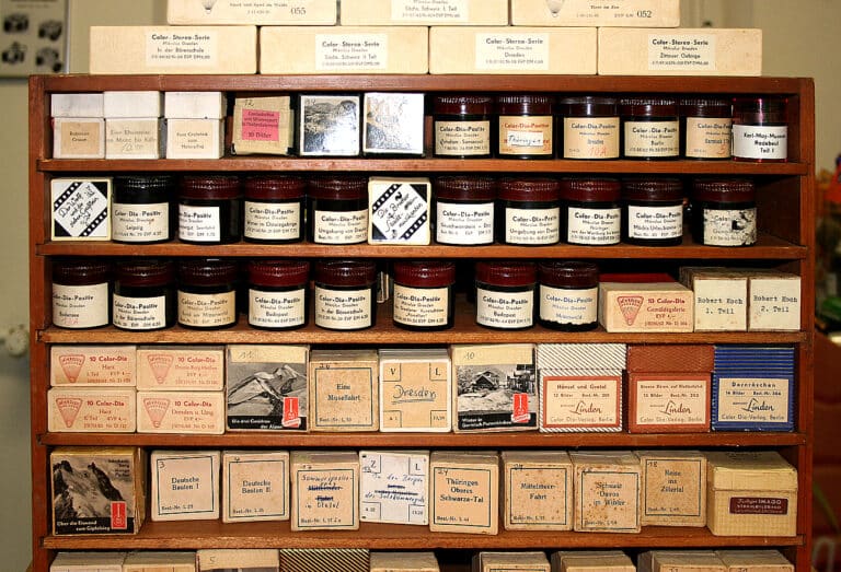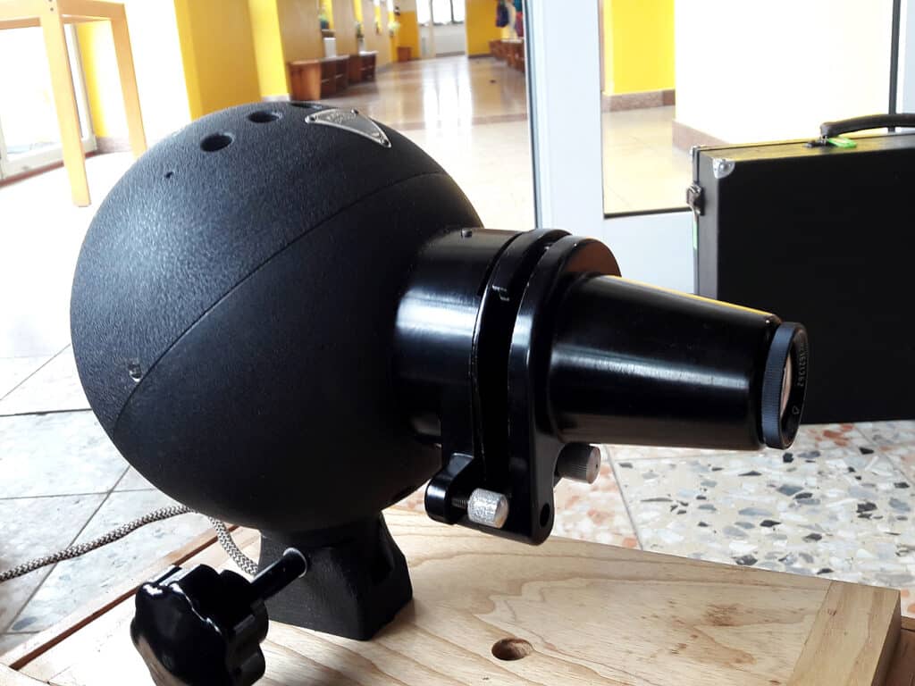 Im Museum mit mit dem Original-Aufbewahrungskasten aus Holz. Auf dessen Deckel ist – Bild – der Projektor montiert. Zum Transport wird der Deckel einfach umgedreht, so dass der „Reise-Projektor“ im Holzkasten hängend untergebracht ist. Oben auf dem Kugelgehäuse ist das dreieckige Firmenlogo von Mikrolux erkennbar.