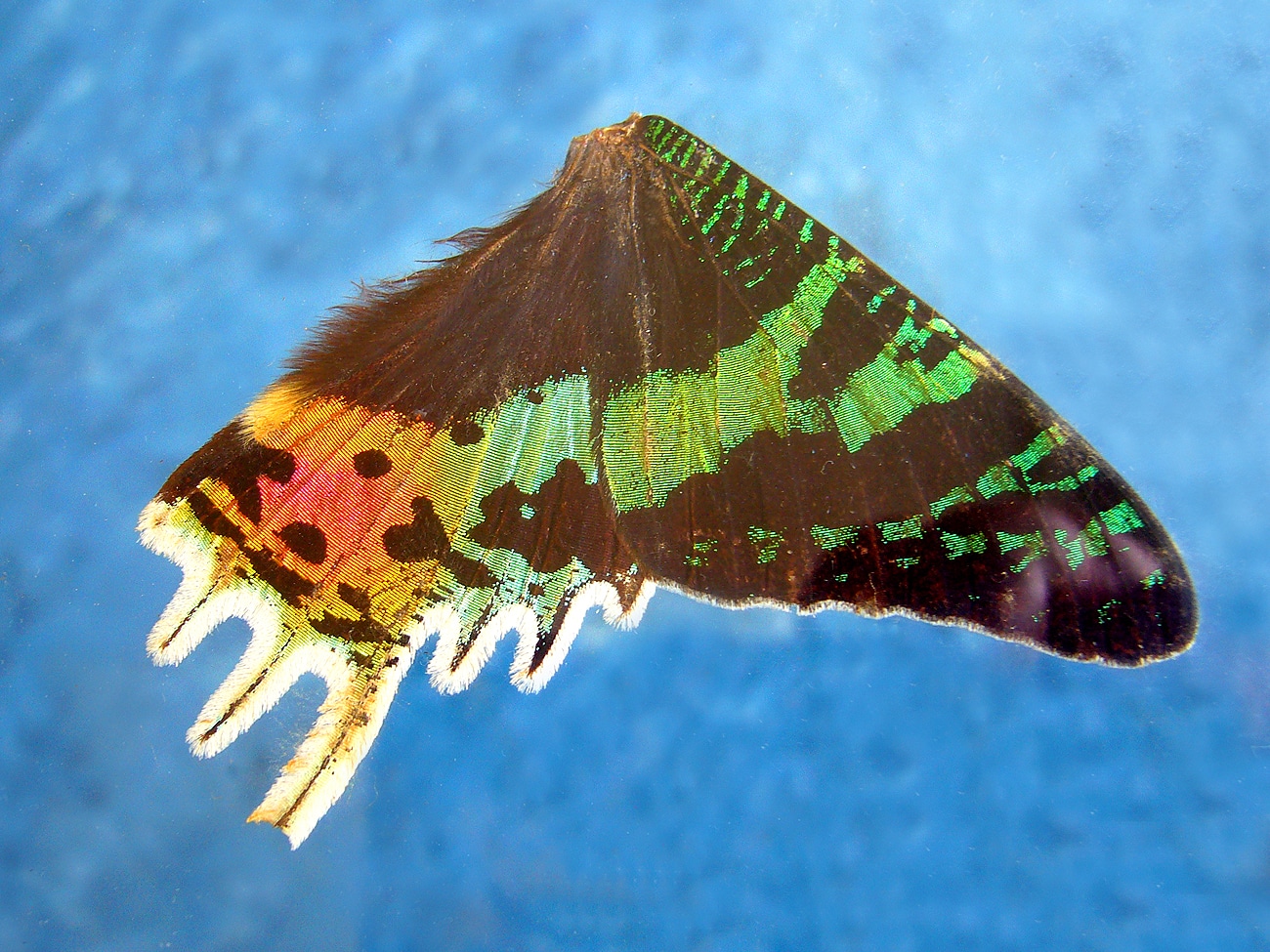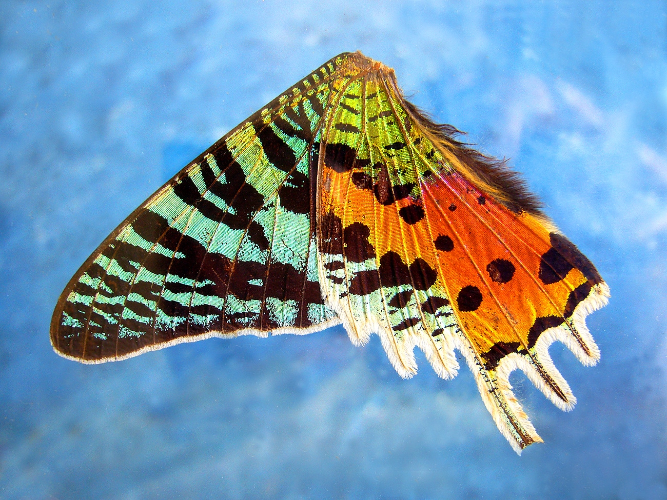 Interessante Überbleibsel aus der Beschäftigung von Hermann Schoepf mit der Mikroskopie und der Fotografie kleinster bis winziger Motive: präparierte Schmetterlingsflügel (im Original jeweils gut acht Zentimeter lang). Bei der Zustiftung Ingrid Lieb aus dem Nachlass Schoepf befanden sich auch Hunderte mikroskopischer Präparate, darunter jede Menge Schmetterlinge, teils noch mit Originalrechnungen aus den 1940er und 1950er Jahren.