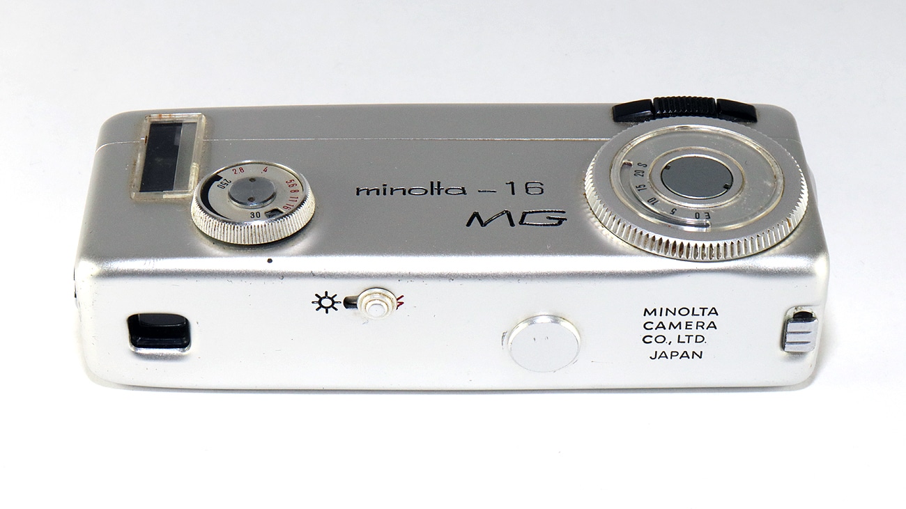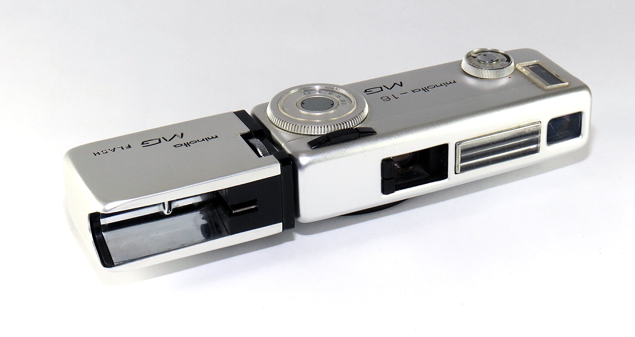 Kleinstbildkamera (1966 bis 1971) für Minolta-16-Kassetten; Negativformat 10 x 14 mm. Objektiv: Rokkor 1:2,8/20 mm (4 Linsen) in Fixfokusfassung Vorschiebbare Porträtlinse (für 1,2 Meter). Blendengekuppelter Nachführbelichtungsmesser (Selen). Mechanischer Zentralverschluss mit 1/30 bis 1/250 Sekunde und Blitzsynchronisation; Programmautomatik.