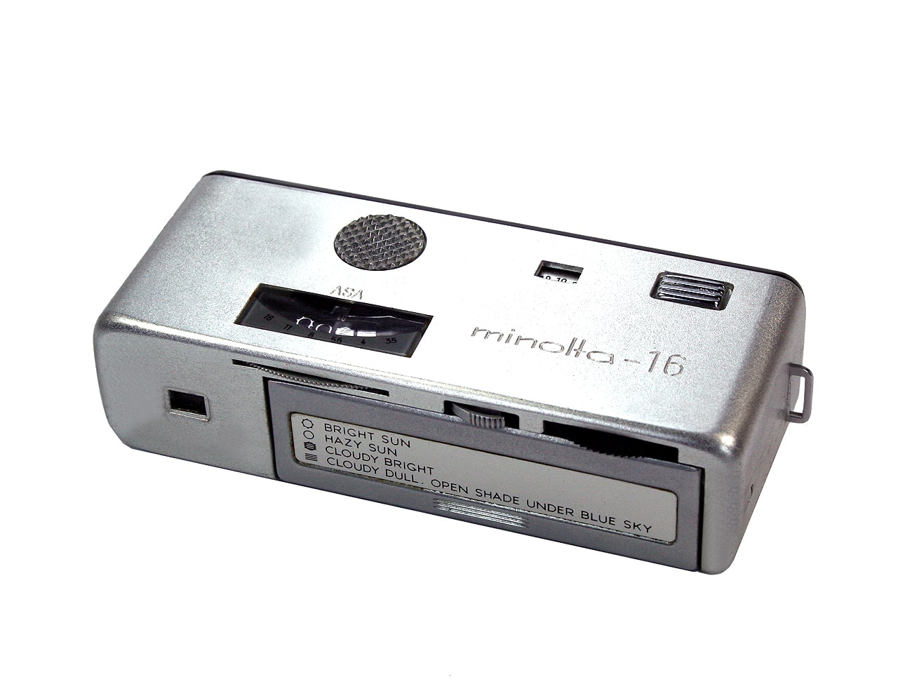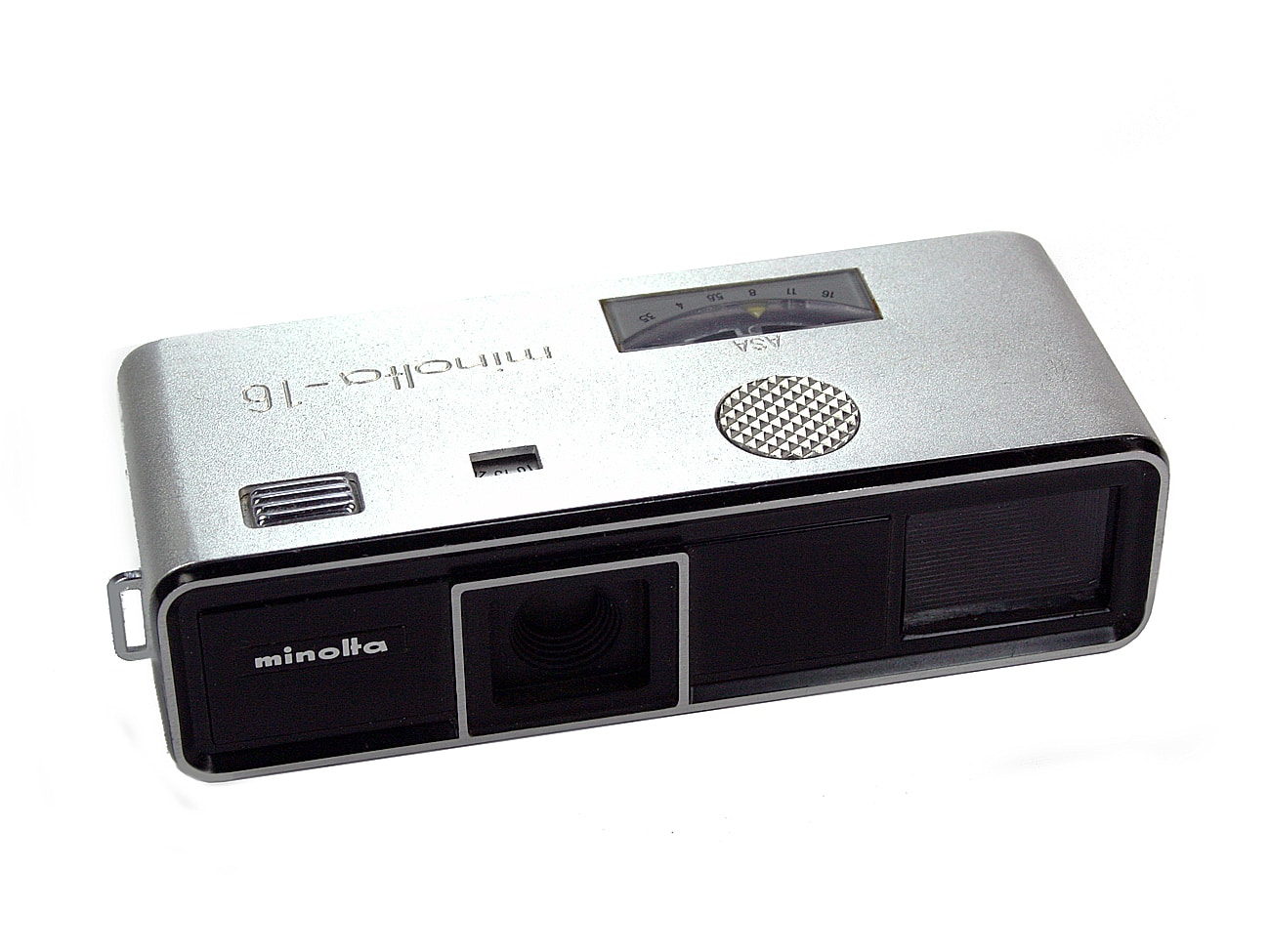 Kleinstbildkamera, hergestellt in Japan von 1960 bis 1965, für 16-mm-Film (Aufnahmeformat 10 x 14 mm). Filmtransportrad an der Kamerarückseite. Objektiv: Dreilinsiges Minolta Rokkor 1:3,5/25 mm in Fixfokusfassung. Blitzsynchronisierter Zentralverschluss mit fest eingestellter 1/100 Sekunde. Manuelle Belichtungssteuerung. Blendeneinstellung mit vier zugeordneten Wettersymbolen oder nach Zahlen. Filmmerkscheibe mit ASA-Skala. Größe: 103 x 27 x 42 mm, Gewicht: 120 g.