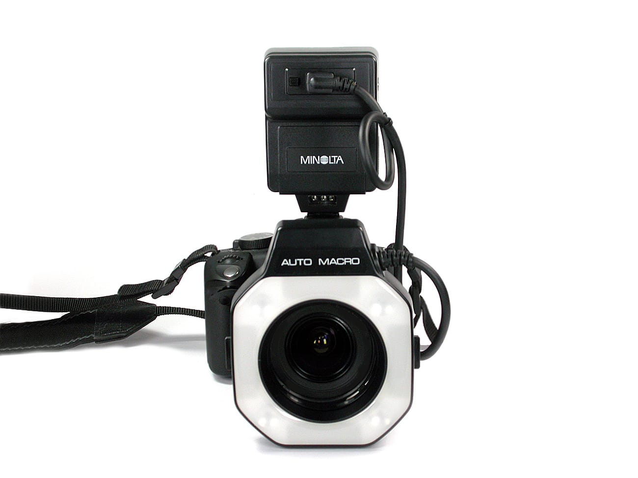 Makro-Ringblitz, Leitzahl 8 (bei ISO 100/21 DIN), mit vier einzeln zuschaltbaren Blitzleuchten zum automatischen Blitzen (TTL-Steuerung) mit den analogen Kameras Minolta X-700, X-500 und X-570; nichtautomatisches Blitzen mit jeder Kamera möglich. Hergestellt in den 1980er Jahren in Japan. Vier Einstelllampen sind eingebaut, die sich automatisch vor Blitzauslösung abschalten. Leuchtdauer: 1/50.000 bis 1/1.000 Sekunde beim automatischen Blitzen, 1/1.000 beim manuellen. Ausleuchtwinkel: 80 Grad. Stromversorgung: 4 x 1,5 Volt (Batterien oder NC-Akkus).