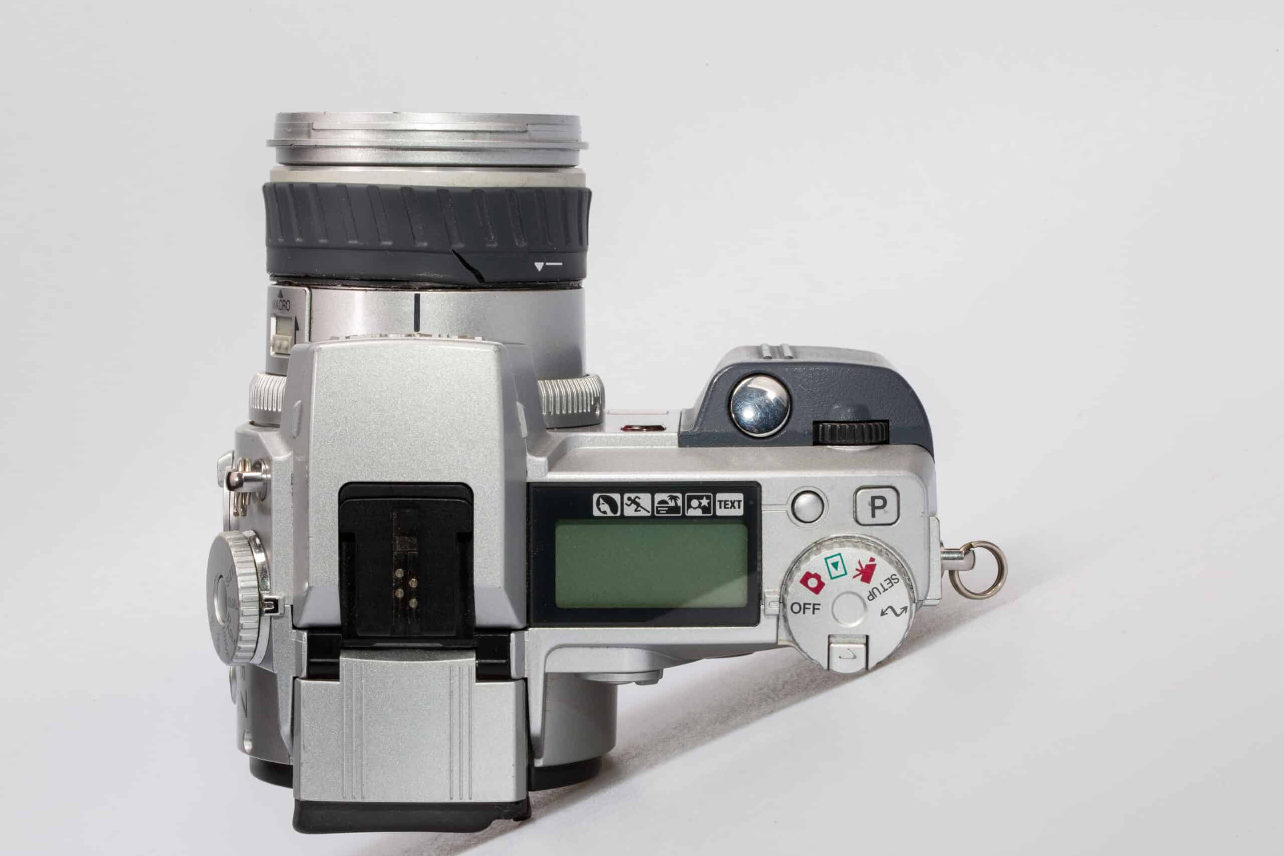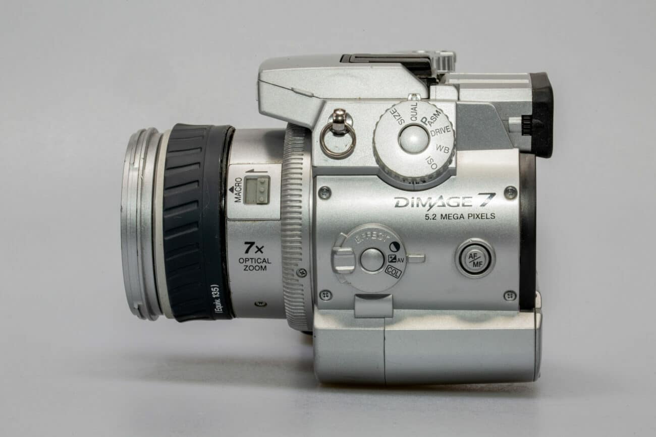 Digitalkamera, hergestellt in Japan zu Beginn der 2000er Jahre. Objektiv: Minolta GT Lens 1:2,8-3,5/7,2-50,8 mm (200 mm Äquivalent); optischer Zoom 7-fach; mit Makroeinstellung; Filtergewinde 49 mm. Sensor: 5,2 Megapixel. Silberfarbenes Gehäuse.