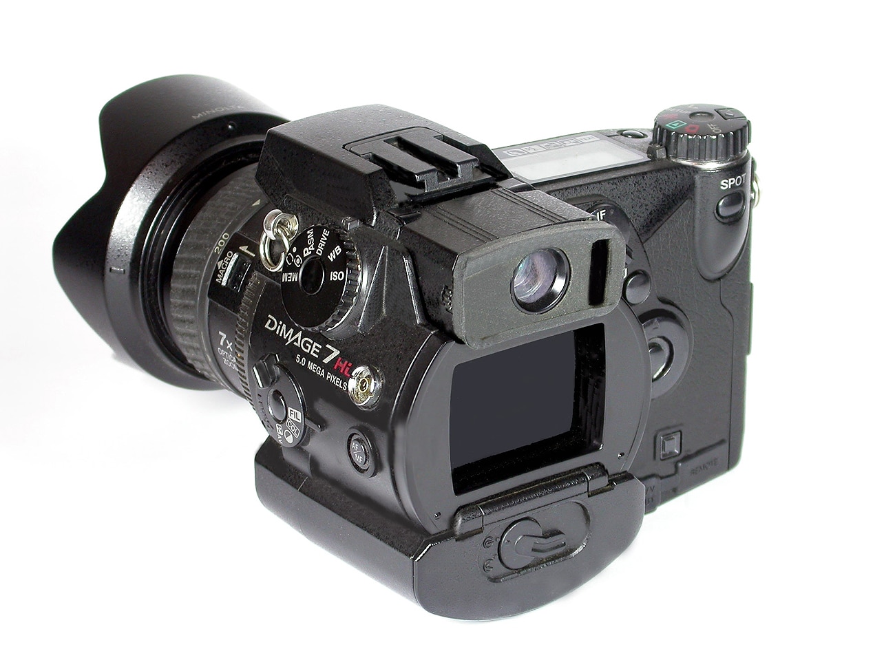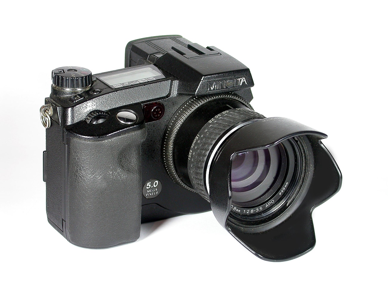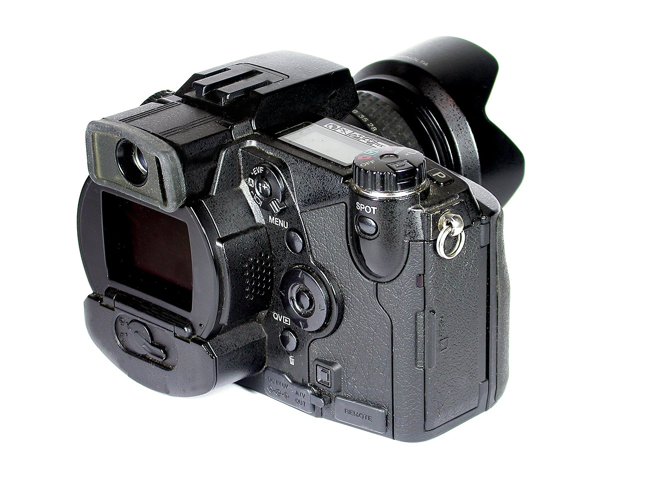 Minolta-Digitalkamera, 2001/2002. Auflösung: 2.560 x 1.920 Pixel, 1.600 x 1.200 Pixel, 1.280 x 960 Pixel oder 640 x 480 Pixel, Farbtiefe: 36 Bit. Sensor: 2/3″-CCD-Chip mit 5.240.000 Pixeln im Dateiformat JPEG, TIFF oder RAW (herstellereigenes Rohdatenformat) oder AVI-Video. Wechselspeicher-Kompatibilität: Compact Flash Typ I, Compact Flash Typ II, Microdrive USB-Schnittstelle. PAL/NTSC-Videoausgang (umschaltbar).