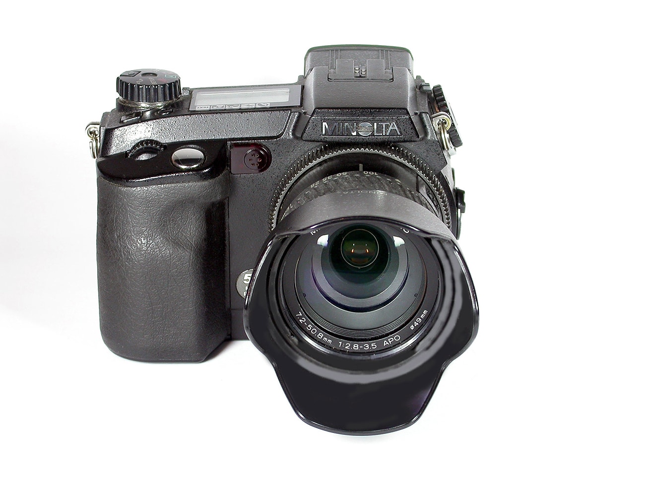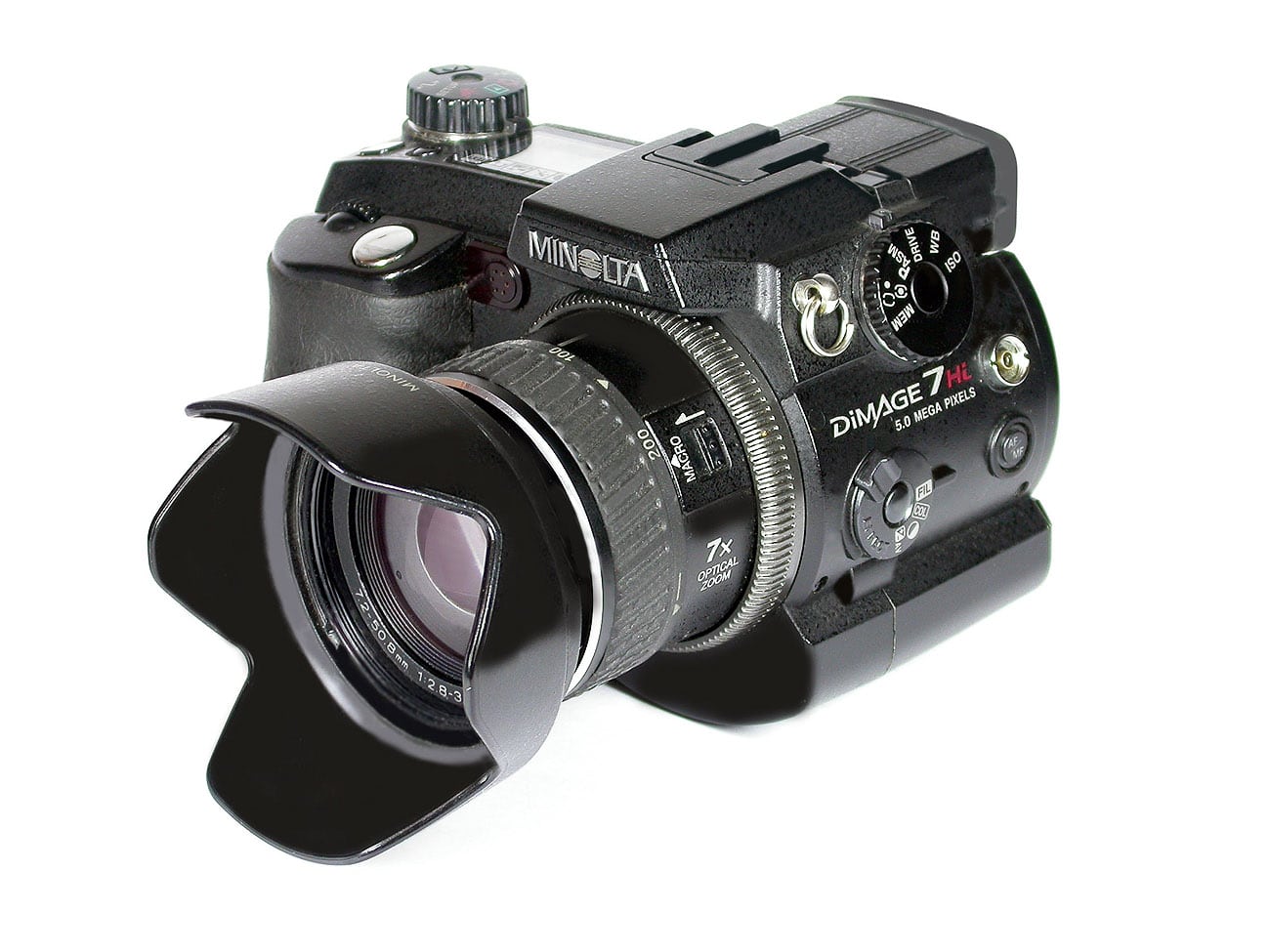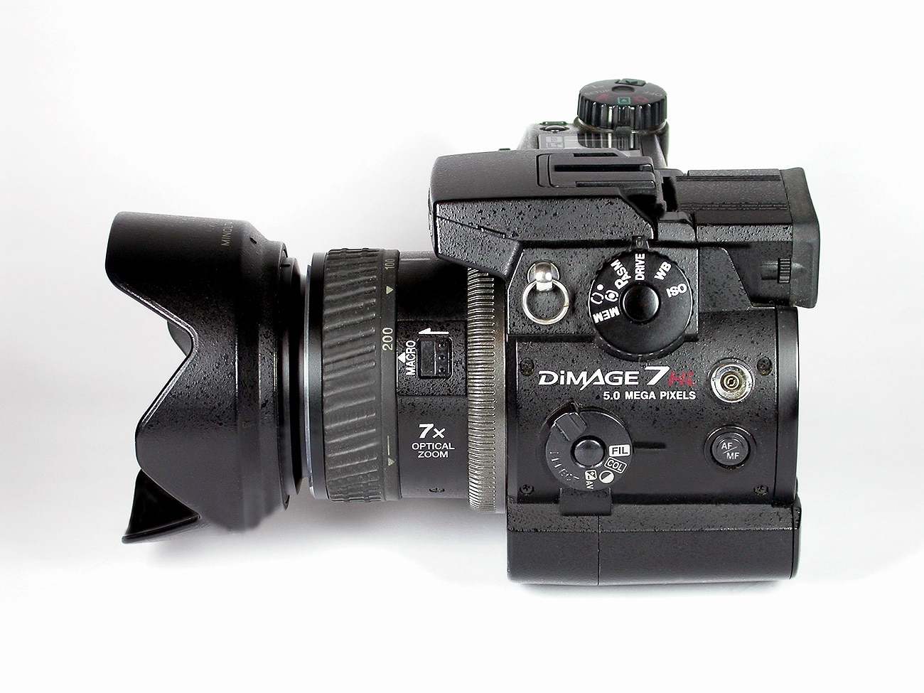 Minolta-Digitalkamera, 2001/2002. Auflösung: 2.560 x 1.920 Pixel, 1.600 x 1.200 Pixel, 1.280 x 960 Pixel oder 640 x 480 Pixel, Farbtiefe: 36 Bit. Sensor: 2/3″-CCD-Chip mit 5.240.000 Pixeln im Dateiformat JPEG, TIFF oder RAW (herstellereigenes Rohdatenformat) oder AVI-Video. Wechselspeicher-Kompatibilität: Compact Flash Typ I, Compact Flash Typ II, Microdrive USB-Schnittstelle. PAL/NTSC-Videoausgang (umschaltbar).