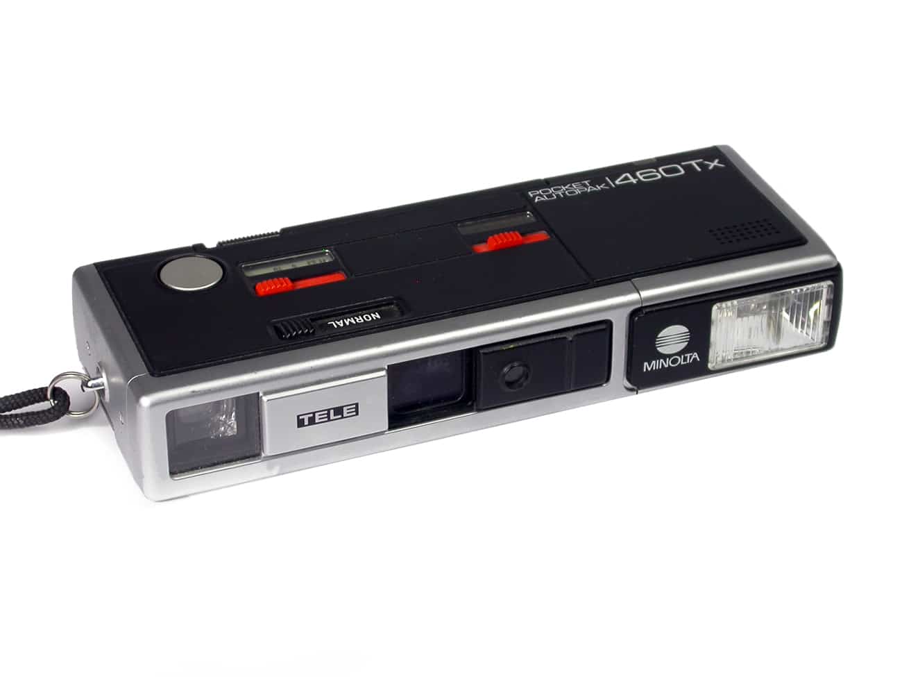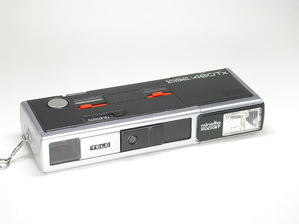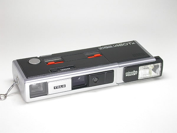 Japanische Kamera für den Pocketfilm 110 (13 x 17 mm), Baujahr 1982. Eingebauter Blitz, Normalobjektiv 1:3,5/25 mm und Teleobjektiv 1:4,7/43 mm umschaltbar. Filmtransport mit Schiebeschalter. Verschluss: Automatik bis 1/200 Sekunde, Einstellung der Entfernung per Schiebeschalter. Im Bild mit eingeschobenem Blitz und Objektiv in Normalstellung.
