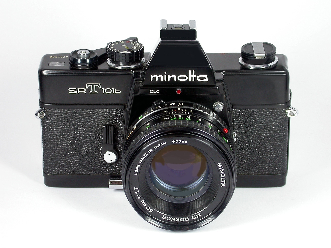 TTL-Belichtungsmessung manuell, CLC-Kontrastausgleich durch besondere Auswertung zweier CdS-Messzellen. Nachführzeiger im Sucher, gekuppelt mit Minolta MD- oder MC-Objektiven. Belichtungszeiten: B, 1 Sekunde bis 1/1.000 Sekunde, manuell einstellbar, eingeblendet im Sucher. Filmempfindlichkeiten: ISO 6 bis ISO 6.400, manuell einstellbar. Entfernungseinstellung manuell, Mikroprismenraster im Sucher. Blitz-Mittenkontakt und Synchro-Buchse, Synchron-Zeit 1/60 Sekunde. Filmtransport manuell per Schalthebel. Umrechnungstabelle DIN/ASA auf der Rückwand mit Einsteckfach für aktuellen Filmpackungsabschnitt. Wechselobjektive für Minolta-MC- und MD-Bajonett (hier mit dem Minolta MD Rokkor 1:1,7/50 mm). Abblendtaste. Stromversorgung: 1 x Batterie 1,35 Volt (Typ EP X-625 oder vergleichbar).