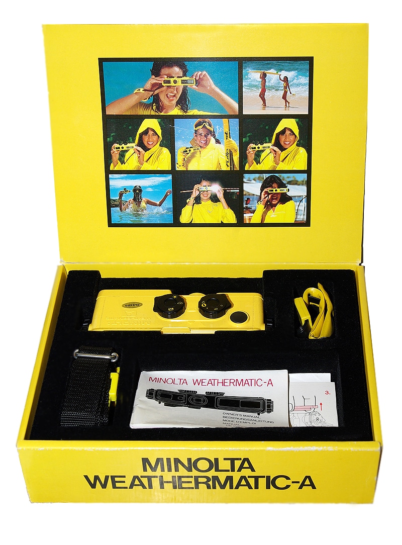 Japanische wasserdichte Allwetter-Pocket-Kamera (1980) für Filme Typ 110; mit eingebautem Elektronenblitzgerät. Objektiv: Minolta 1:3,5/26 mm; 4 Linsen (vergütetes optisches Glas) in 3 Gruppen; Bildwinkel 45° (unter Wasser 34°). Scharfeinstellung: Unendlich bis 90 Zentimeter (kontinuierlich) am Knopf mit 5 Entfernungssymbolen; Schnappschuss-Raststellung. Verschluss: Vor dem Objektiv ablaufender, mechanisch gesteuerter Metall-Lamellen-Verschluss mit fester Verschlusszeit von 1/200 Sekunde. Belichtungseinstellung: Drehknopf mit den drei Raststellungen und Symbolen für Sonne, Wolken und Blitz, je nach Anzeige der Sucherlampe. Abdichtung: Durch zwölf O-Ringe (wasserdicht bis maximal 5 Meter Tauchtiefe). Betriebstemperatur: – 10 bis + 50 Grad Celsius. Im Museum mit Originalverpackung und Zubehör.