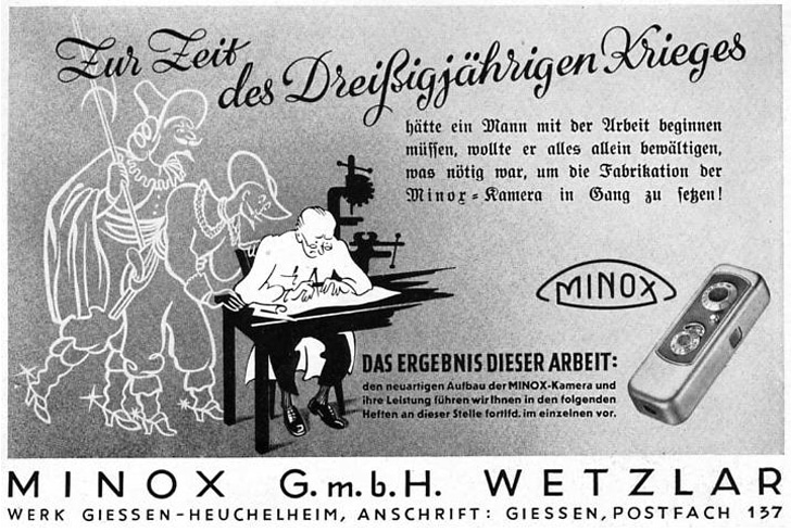 Aus der 1948 erschienenen Produktinformation: „Eine Kamera, die früher in Lettland gebaut wurde (ihr Erfinder ist der Baltendeutsche W. Zapp) und einzelnen Fachleuten bereits damals als Wunderwerk kameratechnischer Erfindungsgabe und Präzision erschien, wird heute in Deutschland hergestellt und erscheint auf dem Photo-Markt: die Minox. Ihr Wiederauftauchen in vervollkommneter Form wird sicherlich in ähnlicher Weise zu Kontroversen über das kleinstmögliche Bildformat Anlass geben wie seinerzeit die Einführung der Leica … Die genauen Ausmaße des Kamerakörpers sind 16 x 28 x 82 mm, das Gewicht beträgt 70 g – also etwa die Abmessungen eines Feuerzeuges.